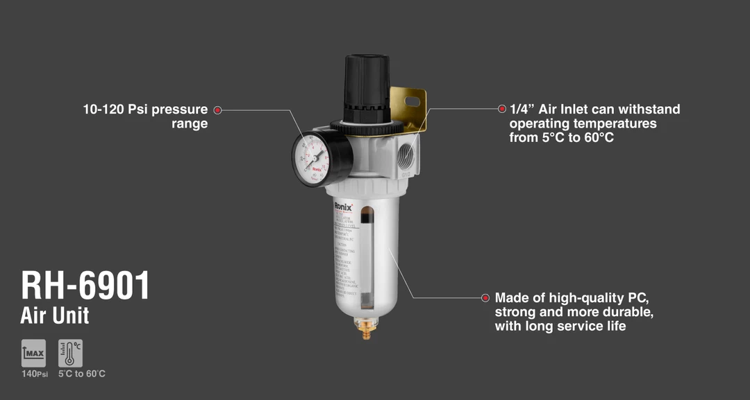 فیلتر و تنظیم کننده هوا یکی از ابزار های بادی پرکاربرد است که وظیفه اصلی آن جذب نا خالصی های موجود در هوا و تنظیم میزان هوای مجاز ورودی است. فیلتر تک رونیکس مدل RH-6901 یکی از محصولات باکیفیت و خوش ساخت شرکت رونیکس است که با بدنه مقاوم و مستحکم، جذب رطوبت هوا و روان کاری خودکار توانسته نظر مصرف کنندگان را به خود جلب نماید. محدوده دمای کاری این محصول بین 5 تا 60 درجه است و حداکثر فشاری که می تواند تحمل کند کوچکتر و یا مساوی با 140 پوند بر اینچ است. لازم به ذکر است که بهترین فشار کاری برای این محصول بین 10 تا 120 پوند بر اینچ می باشد.
