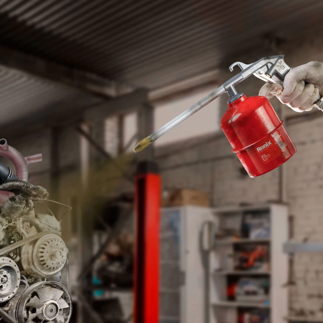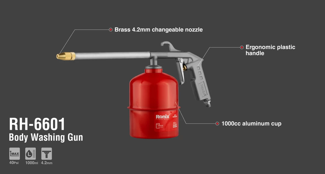گازوییل پاش رونیکس مدل RH-6601 از انواع پیستوله های بادی محسوب می شود که مناسب انجام طیف گسترده ای از فعالیت ها در تعمیرگاه های ماشین، کارگاه ها، مغازه ها و استفاده شخصی می باشد. این گازوئیل پاش بادی مجهز به بدنه ای آلومینیومی و مخزنی قرمز رنگ به ظرفیت 1000 میلی لیتر است. نازل برنجی قابل تعویض این دستگاه از سایز 4.2 میلی متر برخوردار است و می تواند در فعالیت های مختلف تمیزکاری، ضدعفونی کردن، فرو نشاندن گرد و غبار و ... به خوبی موادی مانند بنزین، کف و سایر حلال ها را با فشار زیاد اسپری کند. از دیگر ویژگی های مدل RH-6601 رونیکس سرعت پاشش بالا و قابلیت چرخش به دو طرف است که امکان تمیز کردن آلودگی ها، چربی ها و روغن ها را از روی موتور و ماشین آلات را برای کاربر فراهم می کند.