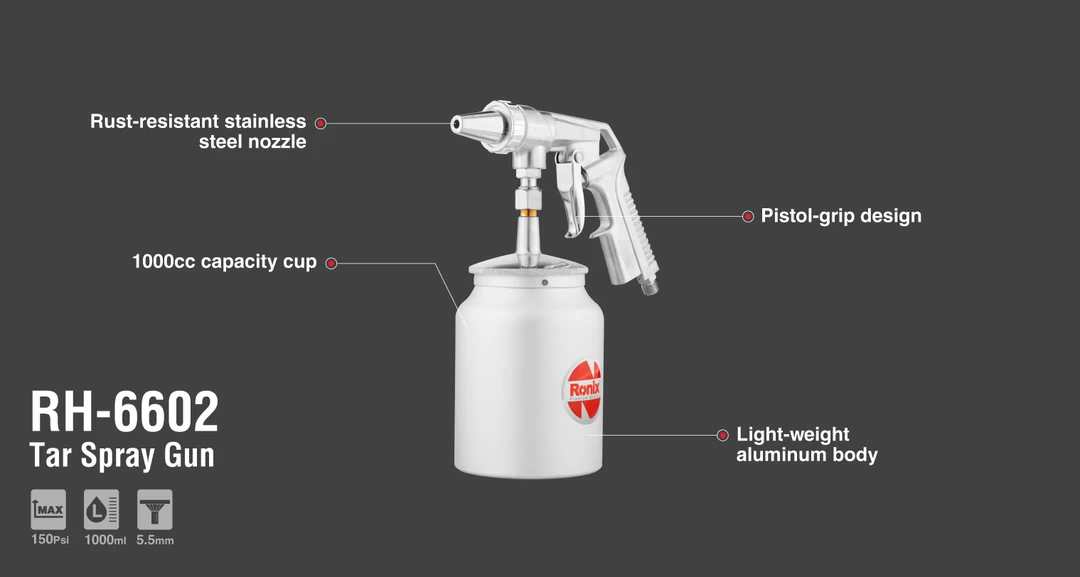 از دیگر ویژگی های پیستوله قیر پاش بادی رونیکس می توان به فشار 150psi و نازل 5.5 میلی متری آن اشاره کرد که با قابلیت تنظیم نحوه پاشش می تواند انجام این فرایند را بر روی سطوح وسیع بدون توقف به پایان برساند. بدنه ساخته شده از آلومینیوم و سبک در کنار دسته ارگونومیک، این ابزار را برای استفاده در کارگاه شخصی و یا سایر مکان ها بسیار مناسب و ایده آل کرده است.