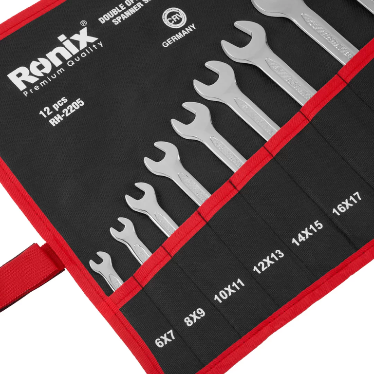 ست آچار 12 عددی دوسر تخت کیفی رونیکس مدل RH-2205 رونیکس در سایزهای 7×6، 9×8، 11×10، 13×12، 15×14، 17×16، 19×18، 22×20، 23×21، 27×24، 28×25، 32×30 تولید و به بازار عرضه شده است.