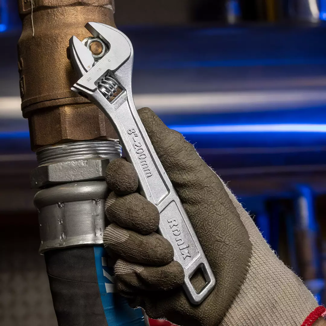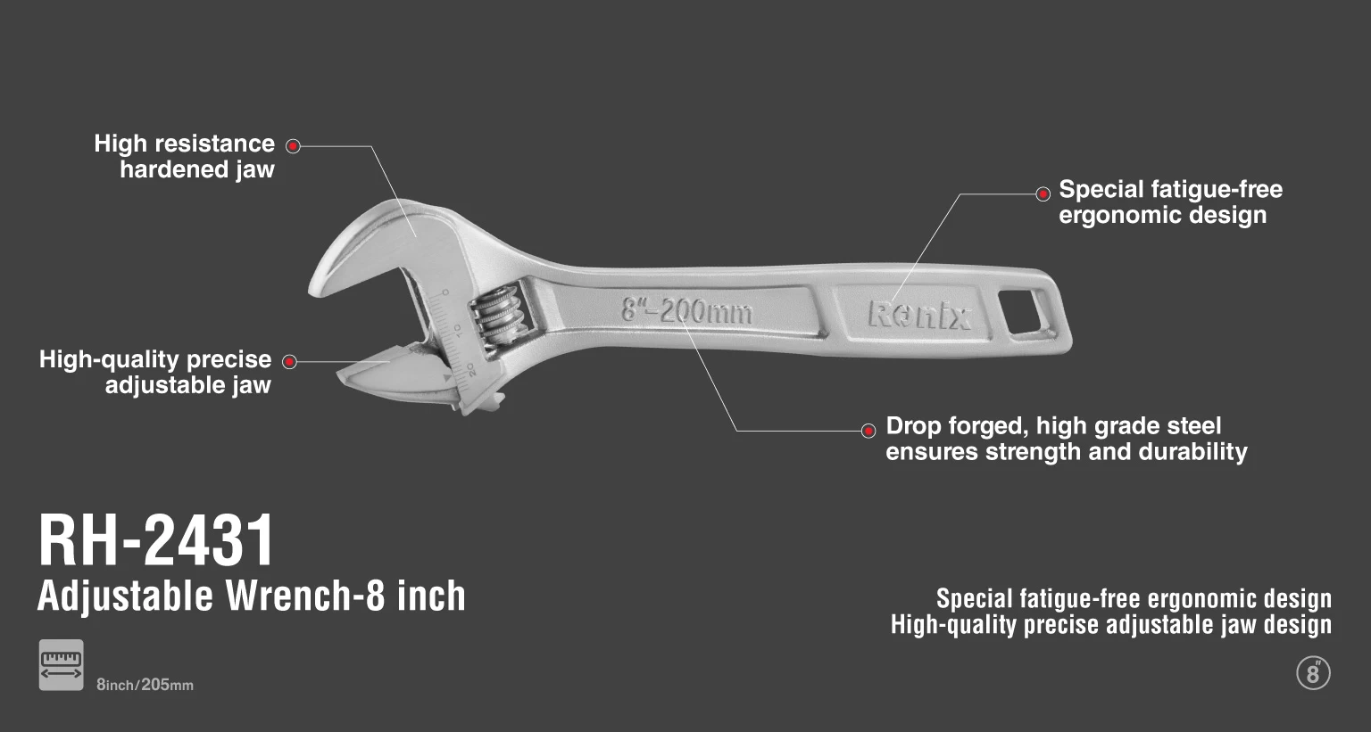 پیچ تنظیم فک متحرک در آچار فرانسه سایز 8 اینچ مدل کروم رونیکس کد RH-2431 از بالاترین دقت و کیفیت برخوردار است و با تنظیم فک، گیرش انواع پیچ و مهره با اندازههای مختلف را امکانپذیر میکند. از دیگر ویژگیهای آچار فرانسه مدل کروم 8 اینچ RH-2431 میتوان به درجهبندی فک آن بر اساس واحد میلیمتر اشاره کرد.