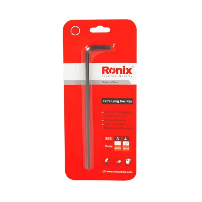 رونیکس هم به عنوان بزرگترین برند بازار ابزار ایران، تولیدکننده انواع آچار آلن به صورت تکی و مجموعه و در اندازههای مختلف است. یکی از بهترین تولیدات این شرکت که به صورت تک به بازار عرضه شده، آلن 4 میلیمتری بلند رونیکس مدل RH-2016 است.