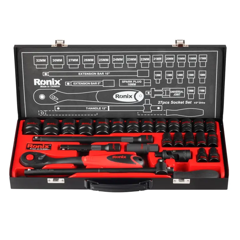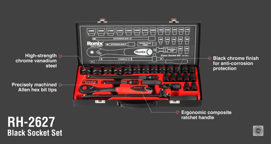 مجموعه بکس 27 عددی رونیکس مدل RH-2627 مجموعه ای دارای 27 قطعه، ساخته شده از مواد باکیفیت سخت کاری شده با گشتاور بالا می باشد. این ست دارای سوکت های فولادی از جنس کروم وانادیوم با مقاومت و استحکام بالا است که با کروم مشکی روکش شده اند تا در برابر زنگ زدگی و خوردگی مقاوم باشند. لبه سوکت ها در این محصول به دقت تراش خورده اند که این ویژگی با ایجاد اندازه های دقیق و انتهای مورب در سوکت ها، قرار دادن بکس بر سطح کار را آسان نموده و از خود دستگاه، سطح کار و پیچ ها در برابر آسیب حاصل از لبه های تیز سوکت محافظت می کند.