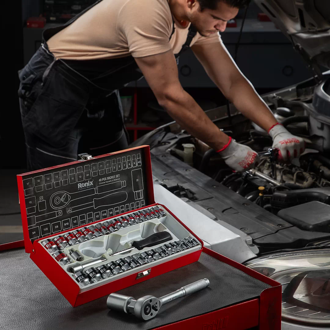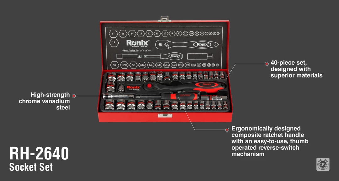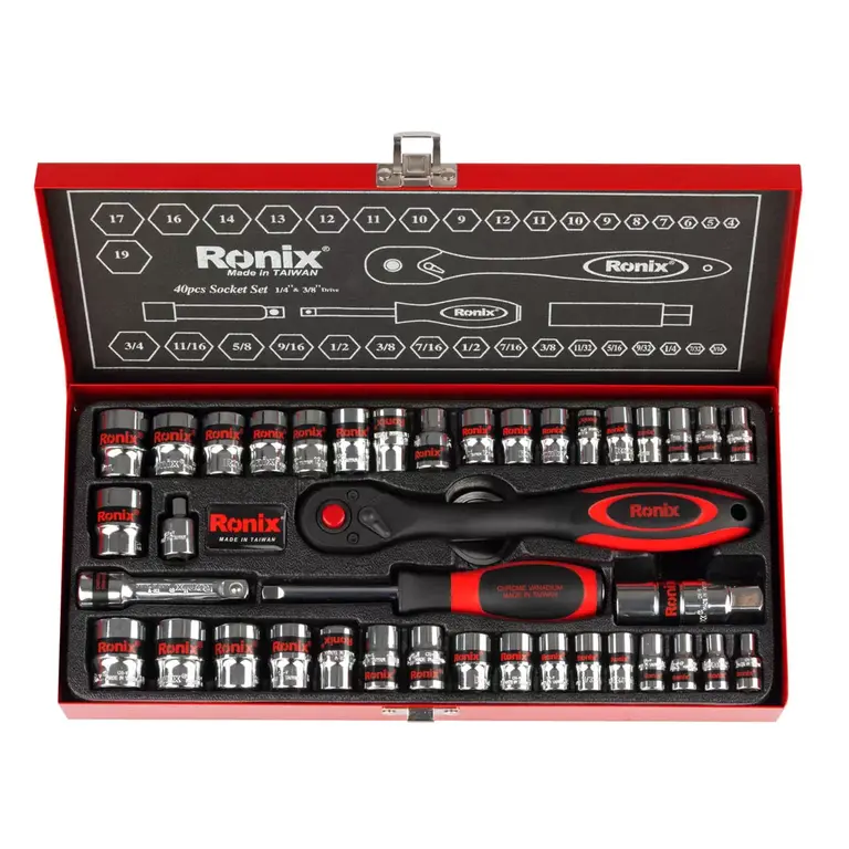مجموعه بکس 40 عددی 3/8 اینچ دسته TPR رونیکس مدل RH-2640مجموعه ای دارای 40 قطعه، ساخته شده از مواد باکیفیت سخت کاری شده با گشتاور بالا می باشد. این ست دارای سوکت های فولادی از جنس کروم وانادیوم با مقاومت و استحکام بالا است که با کروم مات مشکی روکش شده اند تا در برابر زنگ زدگی و خوردگی مقاوم باشند. لبه سوکت ها در این محصول به دقت تراش خورده اند که این ویژگی با ایجاد اندازه های دقیق و انتهای مورب در سوکت ها، قرار دادن بکس بر سطح کار را آسان نموده و از خود دستگاه و سطح کار در برابر آسیب حاصل از لبه های تیز سوکت محافظت می کند.