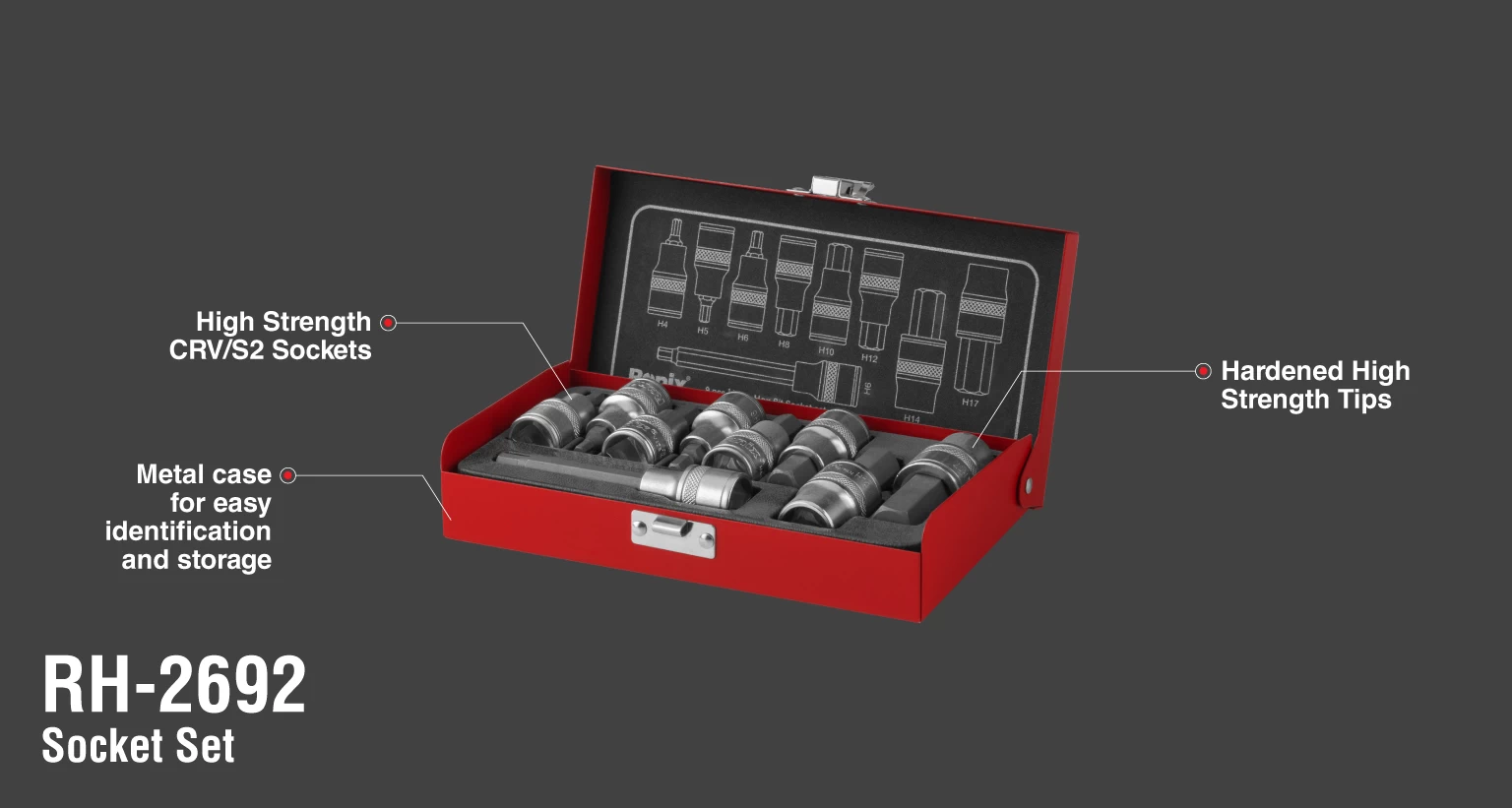 جعبه بکس RH-2692 شامل نه عدد آچار رابط ششگوش و نه عدد سوکت با سایزهای متنوع است که برای کارهای مکانیکی، تاسیسات، مونتاژ و ... قابل استفاده هستند.