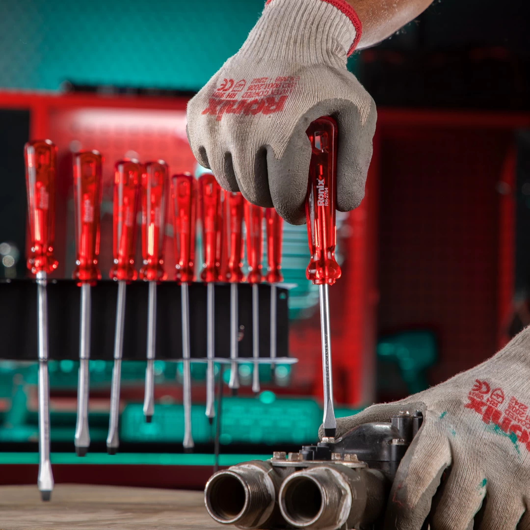 دسته با جنس PVC کریستالی برای کنترل بهتر ابزار؛ با طراحی حرفهای رونیکس که تعادل بین سرعت و گشتاور را در اتصالات مختلف ایجاد میکند.