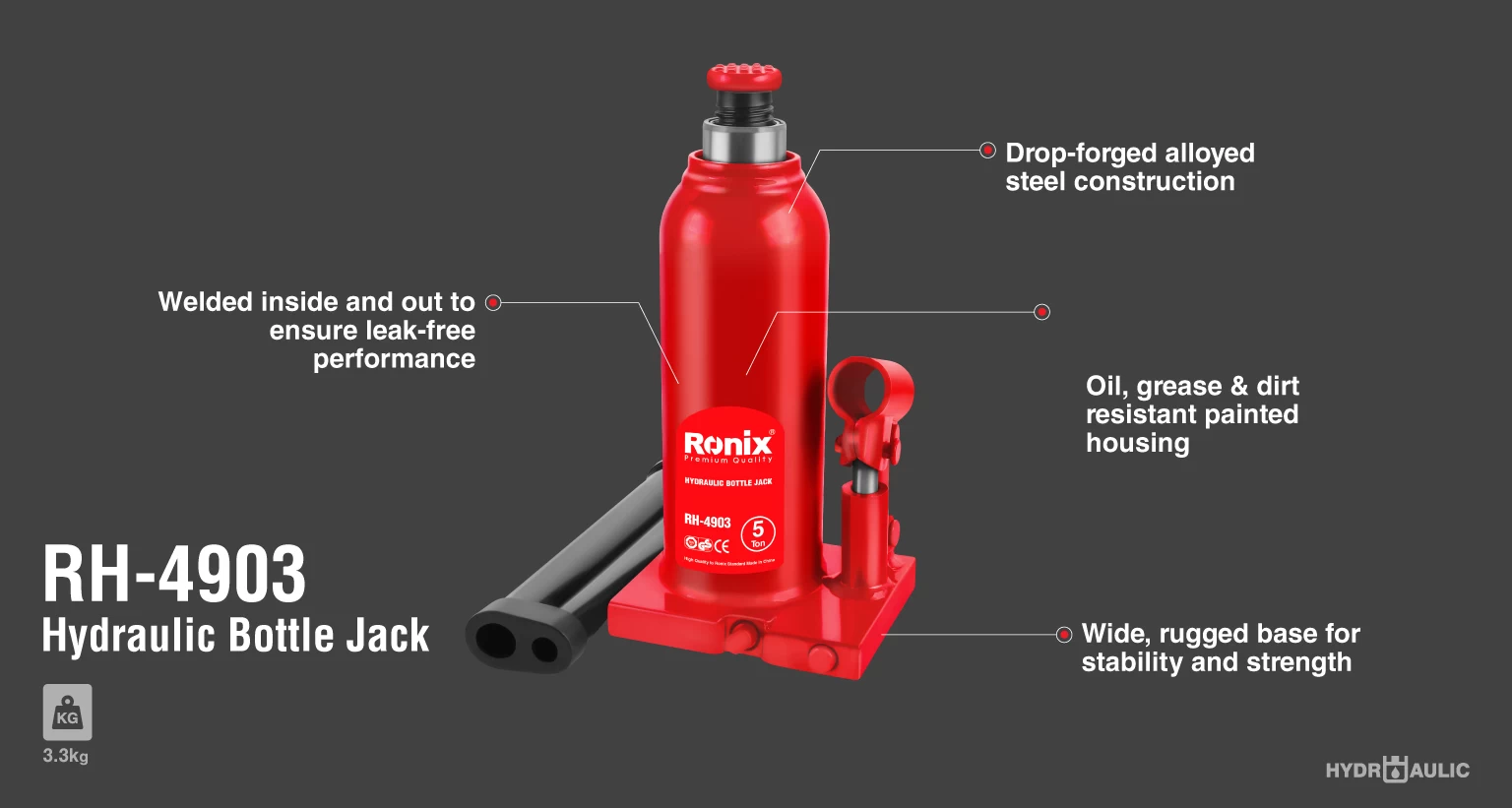 جک روغنی RH-4903 از ابزارهای مناسب برای بلند کردن وسایل نقلیه و مصالح ساختمانی است که به نام جک های هیدرولیکی نیز شناخته می شود. این ابزار با تحمل وزن 5 تن و دوام بالا این امکان را در اختیار کاربران قرار داده که با خیالی آسوده ابزارآلات و تجهیزات سنگین را در محیطهای کاری مختلف تا ارتفاع مدنظر بلند کنند و با اطمینان از سیستمهای پیشرفته این ابزار ساعتهای متمادی به تکمیل پروژههای کاری خود بپردازند. برای آشنایی بیشتر با جک روغنی 5 تن RH-4903 رونیکس به بخش توضیحات محصول مراجعه کنید.