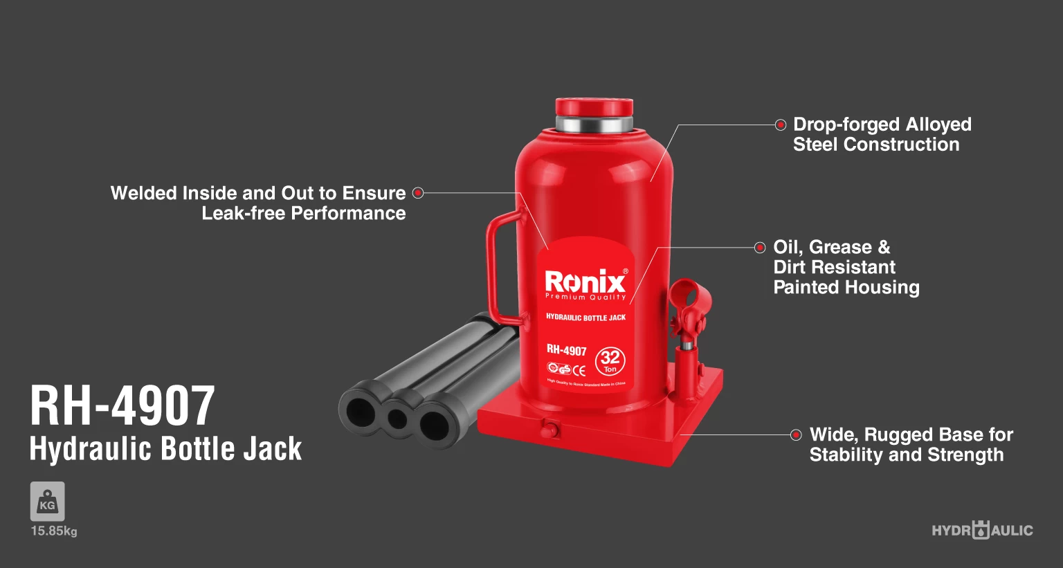 جک روغنی 32 تن RH-4907رونیکس دارای بدنه سختکاریشده و جمعوجور است که به کاربر این امکان را میدهد که از آن به راحتی در محیطهای مختلف کاری برای بلندکردن تجهیزات و اشیاء سنگین بهره ببرد.