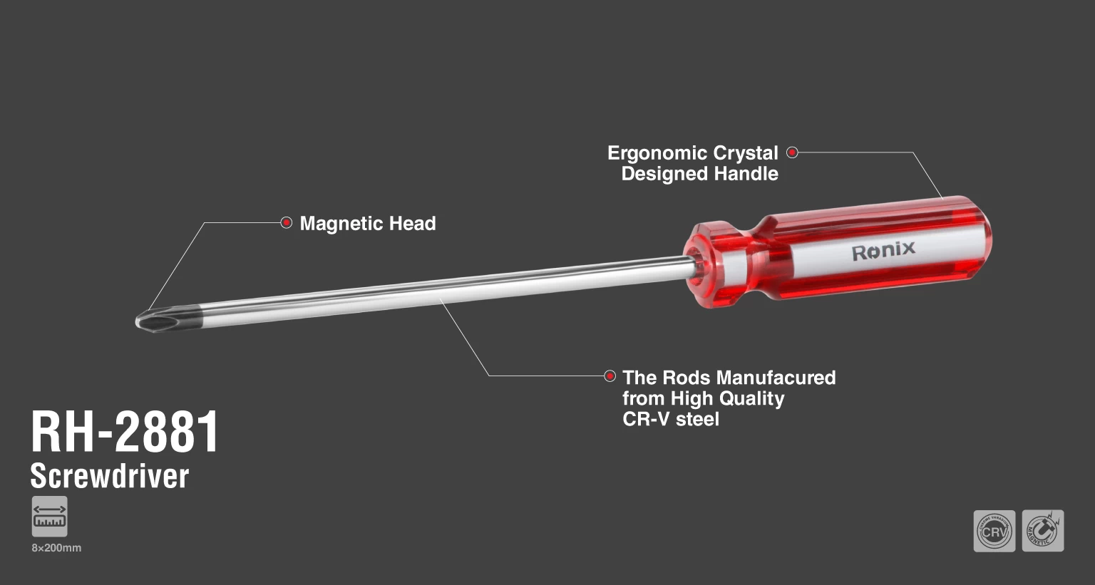 این پیچگوشتی رونیکس از نوع چهارسو و به ابعاد 200×8 میلیمتری طراحی و تولید شده است.
