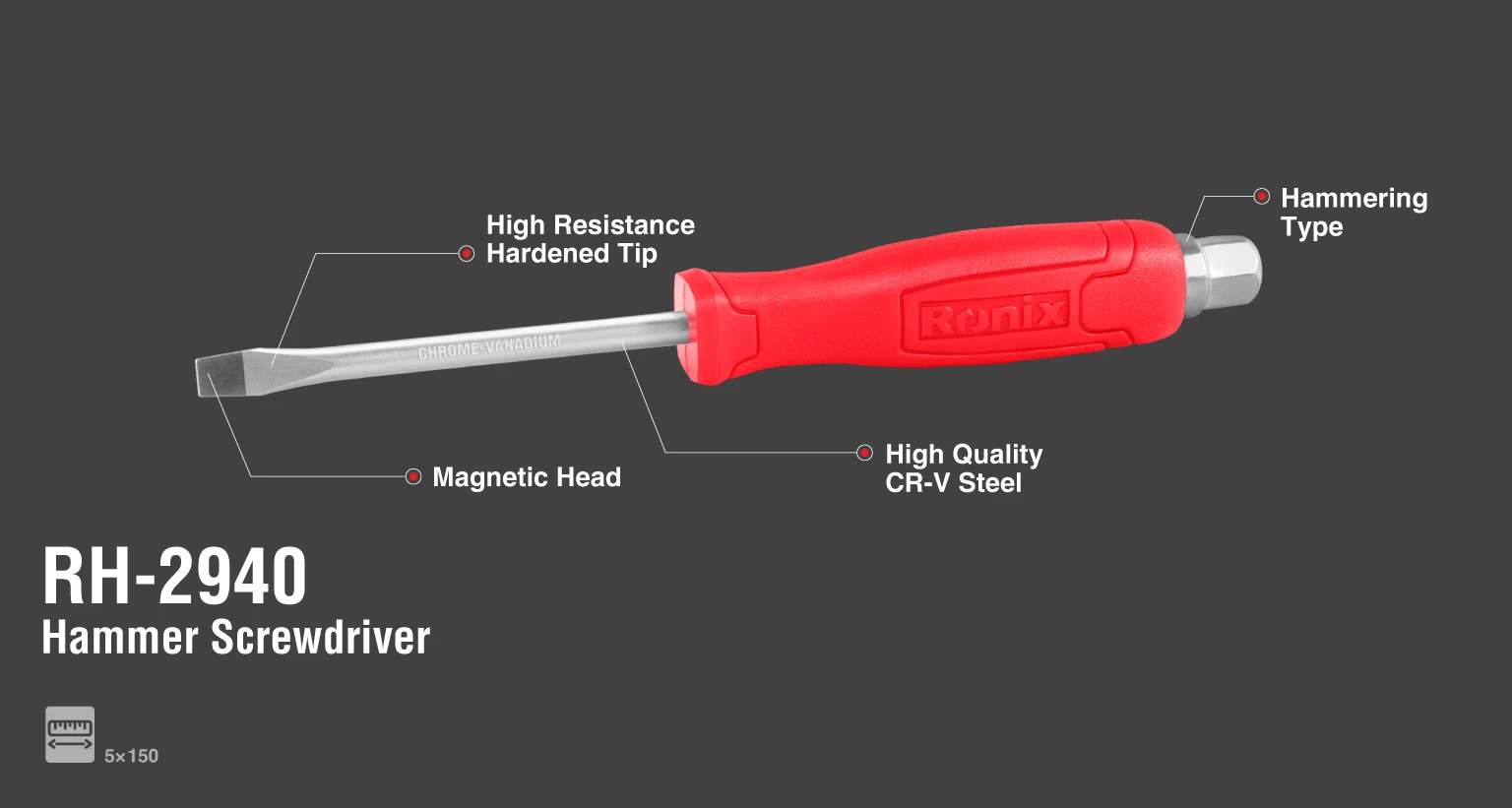 در بخش شرح جزئیات محصول، با مشخصات پیچ گوشتی تکی ضربهخور دسته پلاستیکی 150*5 دوسو رونیکس مدل RH-2940 بیشتر آشنا شوید.