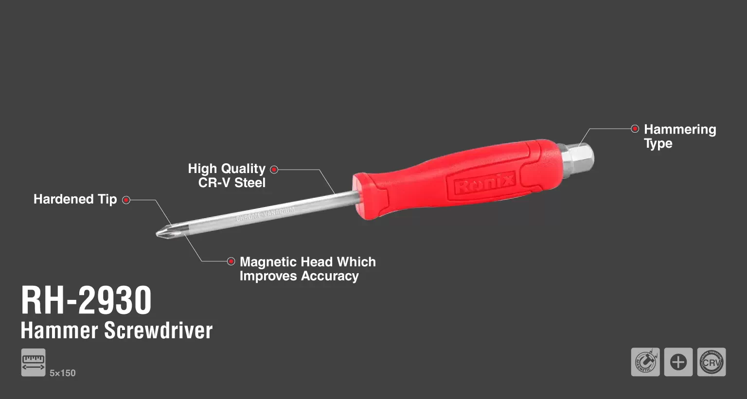 در بخش توضیحات محصول، با مشخصات پیچ گوشتی تکی ضربهخور دسته پلاستیکی 150×5 میلیمتری چهارسو رونیکس مدل RH-2930 آشنا شوید.