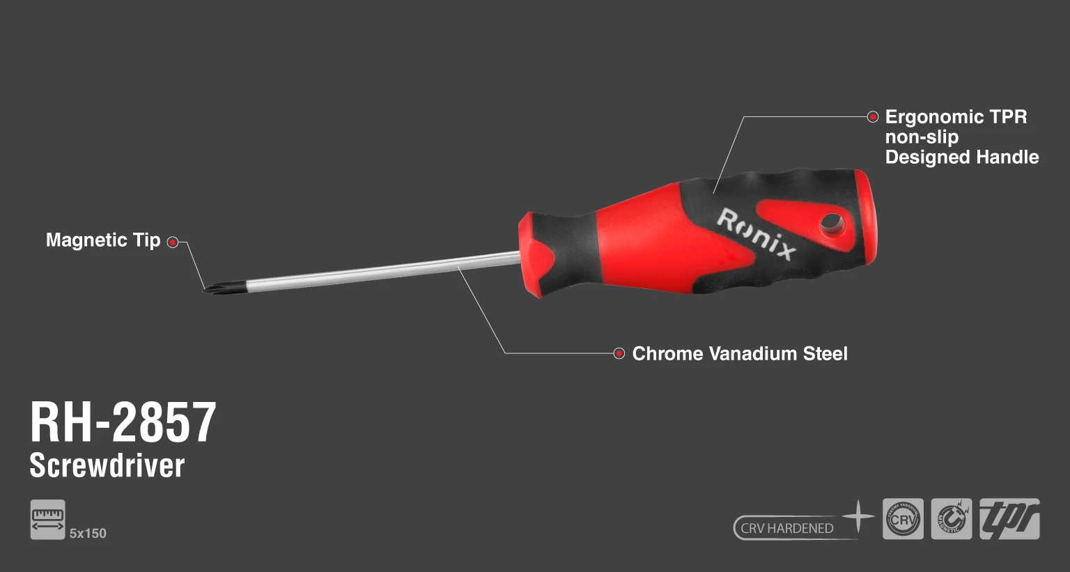 طراحی این پیچ گوشتی به گونه ای است که در استفاده های طولانی مدت کاربری راحتی را برای افراد فراهم می کند. همچنین دسته ضد لغزش آن با برخورداری از روکش TPR کنترل و دقت بالایی را در حین کار به وجود می آورد. از دیگر مشخصات مدل RH-2857 رونیکس پوشش اکسید سیاه در قسمت نوک این ابزار است که باعث حافظت نوک پیچ گوشتی در برابر خوردگی و زنگ زدگی شده و طول عمر بالای آن را تضمین می کند.