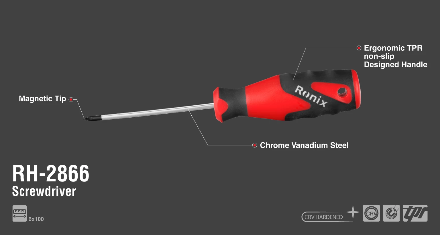 طراحی این پیچ گوشتی به گونه ای است که در استفاده های طولانی مدت کاربری راحتی را برای افراد فراهم می کند. همچنین دسته ضد لغزش آن با برخورداری از روکش TPR کنترل و دقت بالایی را در حین کار به وجود می آورد. از دیگر مشخصات مدل RH-2866 رونیکس پوشش اکسید سیاه در قسمت نوک این ابزار است که باعث حافظت نوک پیچ گوشتی در برابر خوردگی و زنگ زدگی شده و طول عمر بالای آن را تضمین می کند.