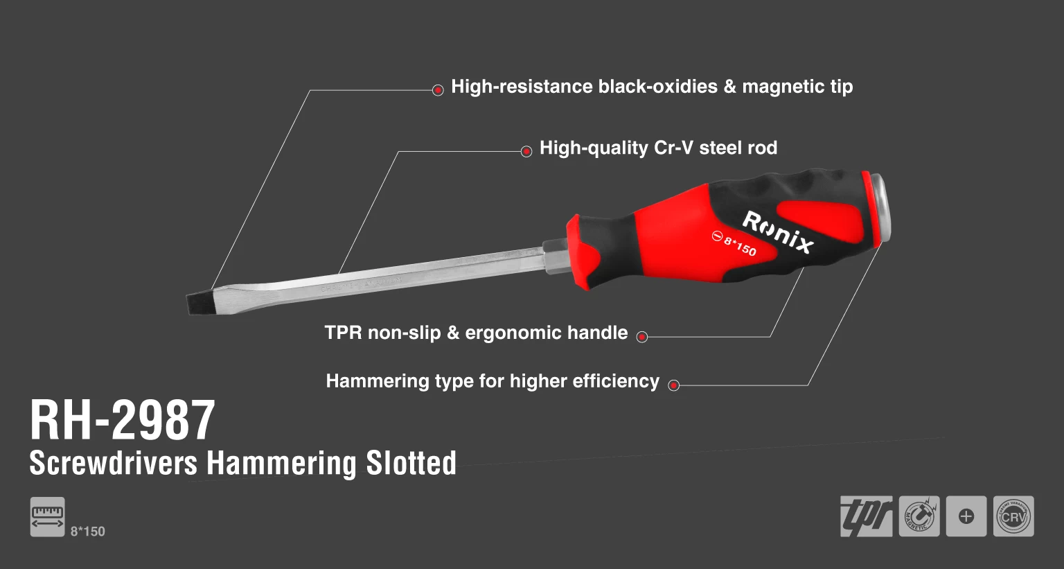 در بخش توضیحات محصول، با مشخصات پیچ گوشتی تکی دسته TPR ضربهخور 150×8 دوسو رونیکس مدل RH-2987 آشنا شوید.