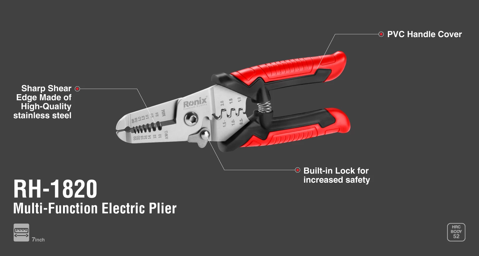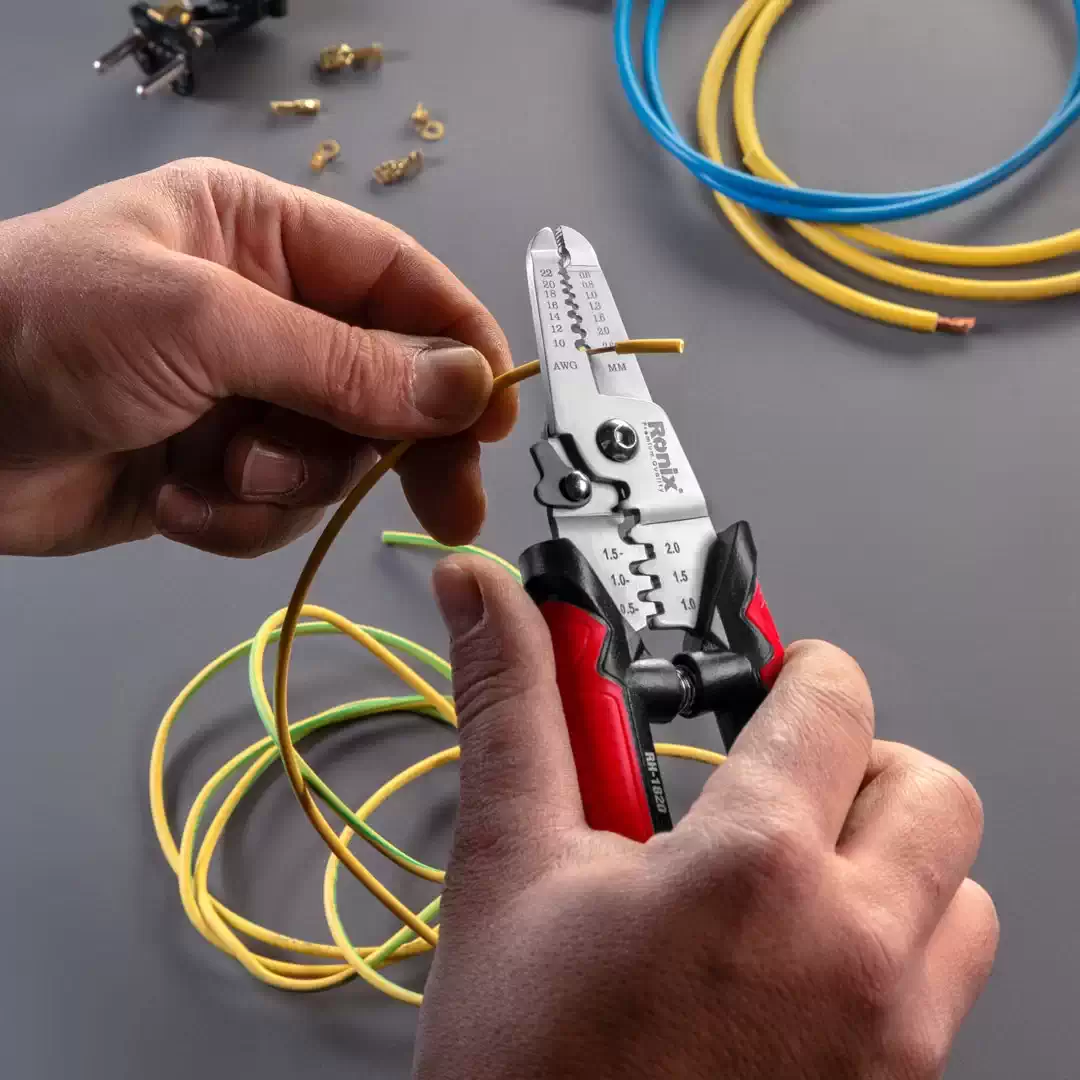 انبر سیم لخت کن چندکاره رونیکس مدل RH-1820، ابزار دستی چندمنظورهای است که از آن برای برداشتن عایق سیمها تا قطر 2.6 میلیمتر، برش کابل و سیم تا قطر 2.6 میلیمتر و پرسکردن سر سیمها تا سطح مقطع 2 میلیمتر استفاده میشود. این محصول پرکاربرد رونیکس در بخش مونتاژ، تعمیرات صنایع الکترونیکی و برش خطوط قدرت، عملکرد ایدهآلی را از خود نشان میدهد.