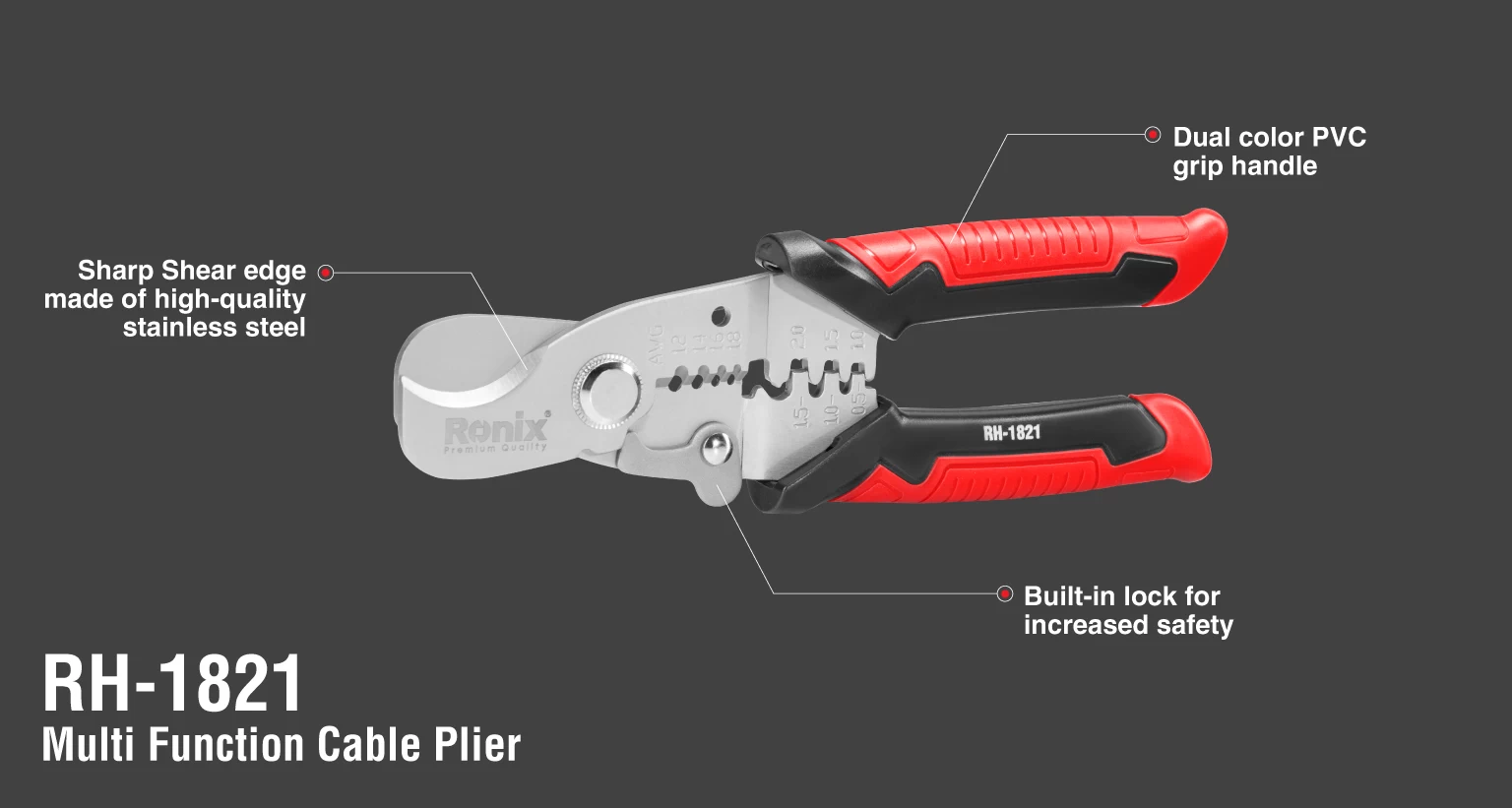 انبر کابلبر چندکاره رونیکس مدل RH-1821، ابزاری دستی است که از آن برای برداشتن عایق سیمها تا قطر 2 میلیمتر، برش کابل و سیم تا قطر 16 میلیمتر و پرسکردن سر سیمها تا سطح مقطع 2 میلیمتر استفاده میشود. از این محصول چندمنظوره برای مونتاژ، تعمیرات صنایع الکترونیکی و برش خطوط قدرت استفاده میشود.