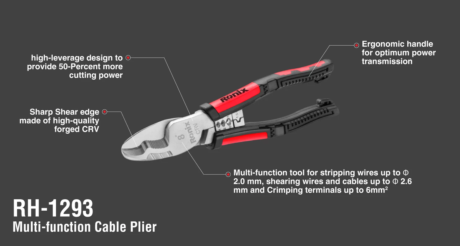 -یک ابزار کارآمد چند منظوره برای لخت کردن سیم ها تا قطر 2 میلیمتر،برش کابل و سیم تا قطر 16 میلیمتر و پرس کردن سر سیم ها تا سطح مقطع6 میلیمتر مربع