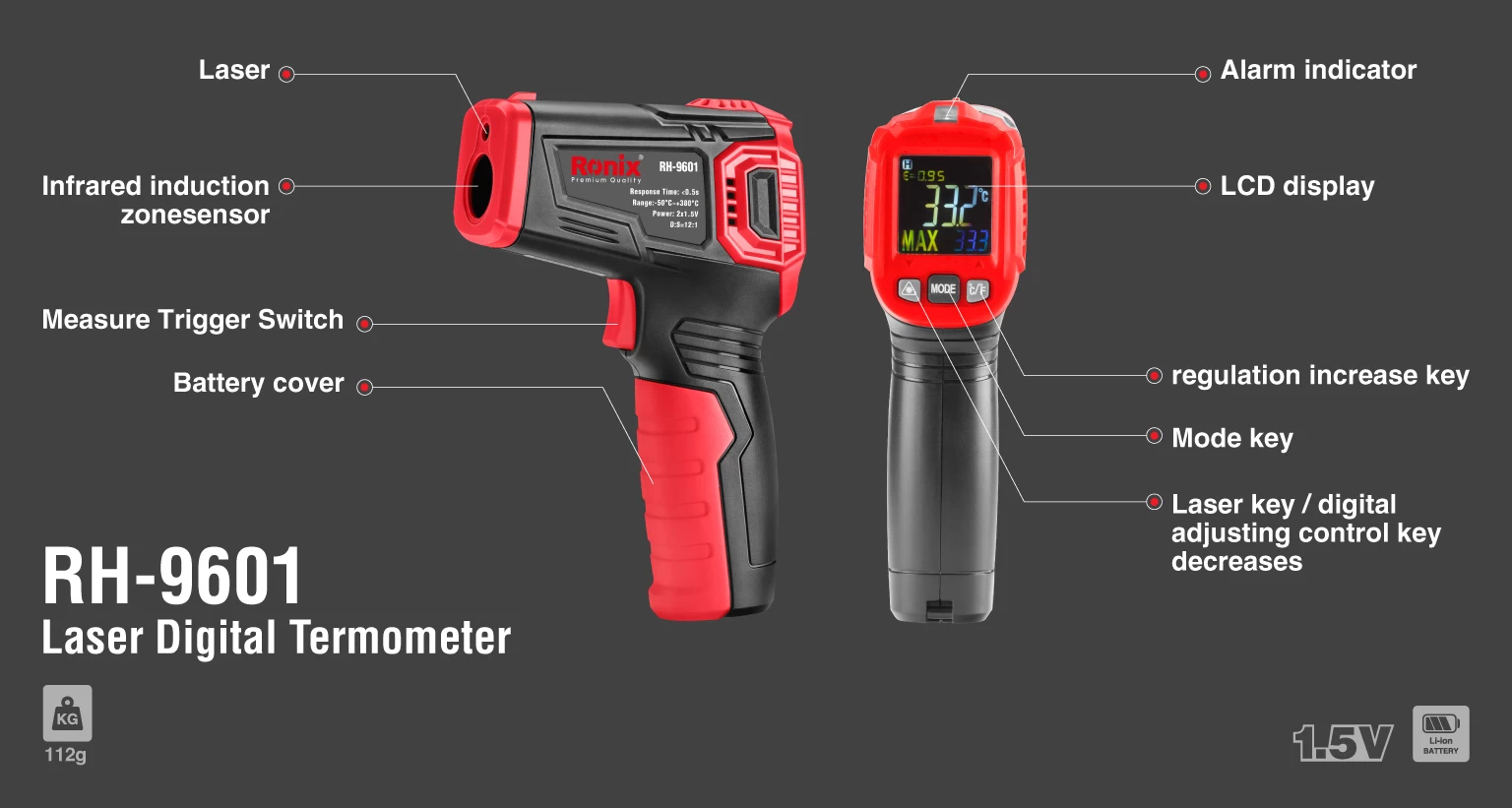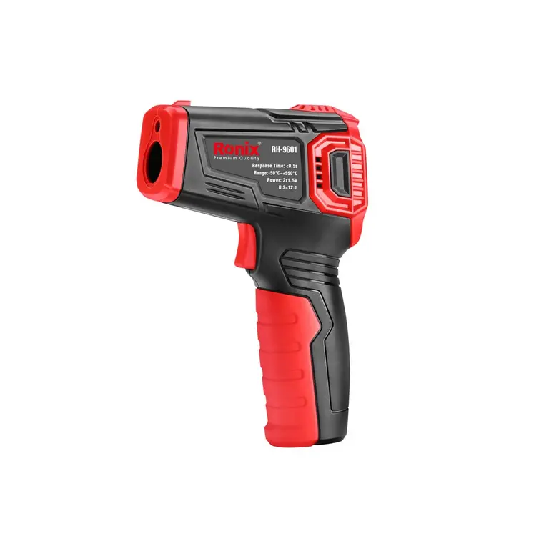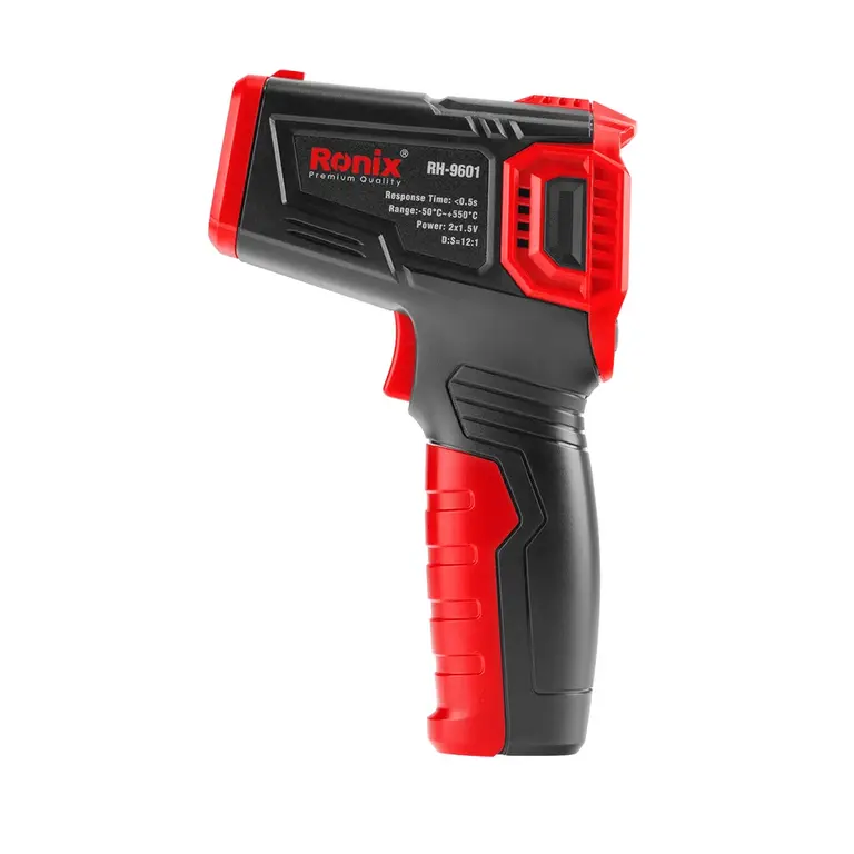 ترمومتر دیجیتالی لیزری رونیکس مدل RH-9601 با صفحه نمایش بزرگ و نور پسزمینه قابل قبول، امکان اندازهگیری دقیق دما را بر روی سطوح مختلف مانند مواد غذایی منجمد، شیشه، آهن، سنگ مرمر، خاک رس، برنج، چوب و … فراهم میکند.