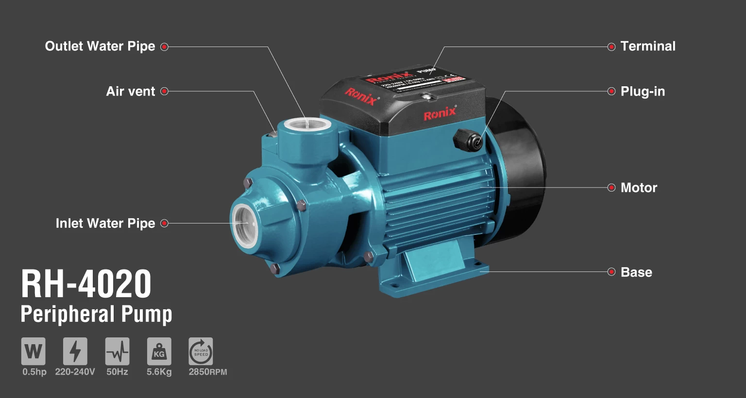 پمپ آب محیطی 0.5 اسب بخاری RH-4020 رونیکس، ترکیبی از فشار بالای تخلیه در پمپهای جابجایی مثبت و انعطافپذیری عملکرد پمپهای گریز از مرکز را ارائه میدهد. این دستگاه در کاربردهایی نظیر انتقال آب در سطوح و خانههای ویلایی یکطبقه بیشترین استفاده را دارد.
