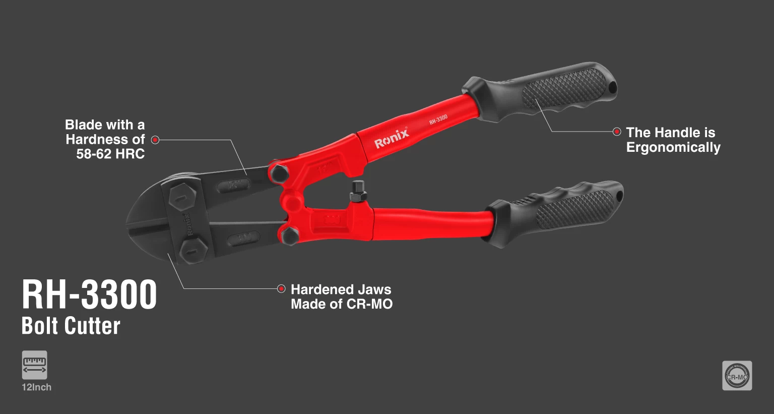 مفتول بُر سایز 12 اینچ رونیکس مدل RH-3300 داری فکهای برشی قوی از جنس فولاد کروم مولیبدن با دوام و کارایی بالا است. دسته ارگونومیک با روکش ضد لغزش برای حداکثر گیرایی در حین کار برای راحتی کاربر طراحی و تولید شده است. این محصول دارای تیغههای سختکاریشده تا 62-58 راکول سی به منظور برشکاری راحتتر حین کار است.