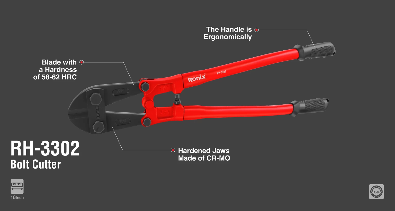 جنس دستههای این ابزار پرقدرت رونیکس از آلیاژ فولاد است. این دستهها با روکش رابر ضد لغزش پوشیده شدهاند تا بهترین کاربری را برای کاربر فراهم کند. تیغههای سختکاریشده RH-3302 از جنس کروم مولیبدن است؛ آلیاژ قدرتمندی که این محصول را برای برشکاری انواع فلزات ایدهآل میکند. همچنین، این ابزار دارای تیغههای سختکاریشده تا 62-58 راکول سی به منظور برشکاری راحتتر در حین کار است.
