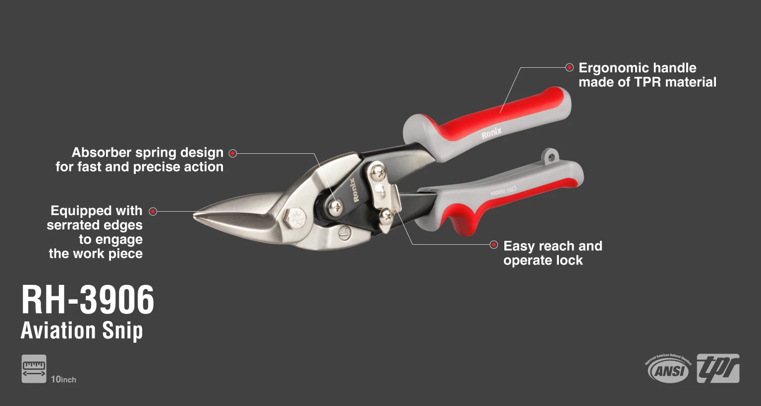 قیچی ورقبر چپبر RH-3906 رونیکس با دسته قرمز رنگ، اهرمهای قدرتمندی دارد و ورقهای فلزی را به آسانی در جهت پادساعتگرد برش میزند. کاربران چپدست به راحتی با این قیچی 0.4 کیلوگرمی کار میکنند. از این ابزار دستی رونیکس برای برش ورقهای فولاد نورد سرد به ضخامت 1.2 میلیمتر و ورقهای فولاد ضد زنگ به ضخامت 0.7 میلیمتر استفاده میشود. کاربرد روکش لاستیک گرمانرم TPR در دسته قیچی ورقبر چپبر RH-3906 رونیکس موجب افزایش ایمنی کاربران در حین کار و قابلیت انجام برشهای دقیق با این ابزار میشود.