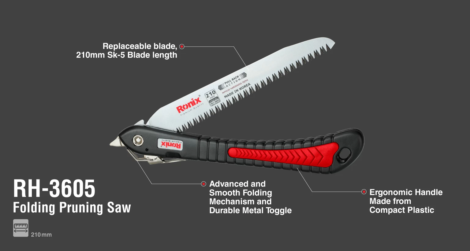 در بخش توضیحات محصول با مشخصات اره باغبانی تاشو کرهای 21 سانتیمتر - RH-3605 رونیکس آشنا میشویم.