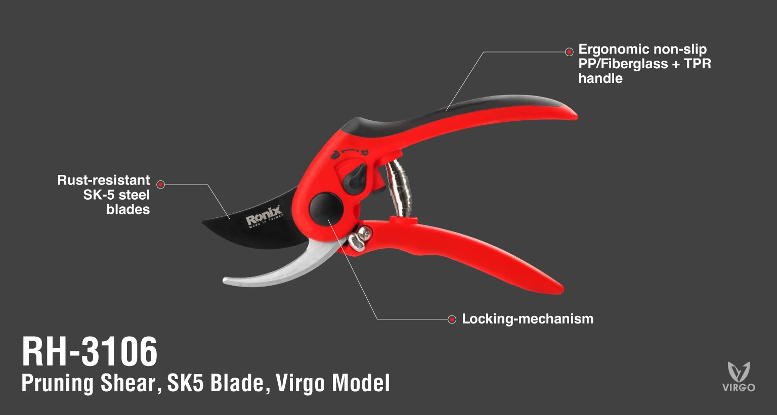 قیچی باغبانی ویرگو رونیکس مدل RH-3106 ابزاری مناسب برای هرس حرفه ای درختان بوده که ساخت کشور تایوان می باشد. این ابزار مجهز به تیغه های سخت کاری شده و تولید شده از فولاد SK-5، مقاوم در برابر زنگ زدگی با روکش ضد چسبندگی است که برای برش های آسان و صاف طراحی شده اند. برای این قیچی باغبانی یک فنر مقاوم و در عین حال نرم تعبیه شده که پس از هر برش لبه های قیچی را از هم باز می کند تا خستگی دست کاربر را به حداقل برساند. از دیگر ویژگی های این قیچی قابلیت تنظیم باز شدن دسته است تا برای اندازه های مختلف دست مناسب باشد. همچنین این ابزار باغبانی مجهز به دسته ارگونومیک PP + TPR / فایبرگلاس ضد لغزش است که موجب افزایش راحتی کاربر و کاهش خستگی او به هنگام انجام کارهای طولانی مدت می شود. قیچی RH-3106 رونیکس دارای قفل ایمنی بوده که ایمنی را در زمان استفاده از ابزار تضمین می کند.