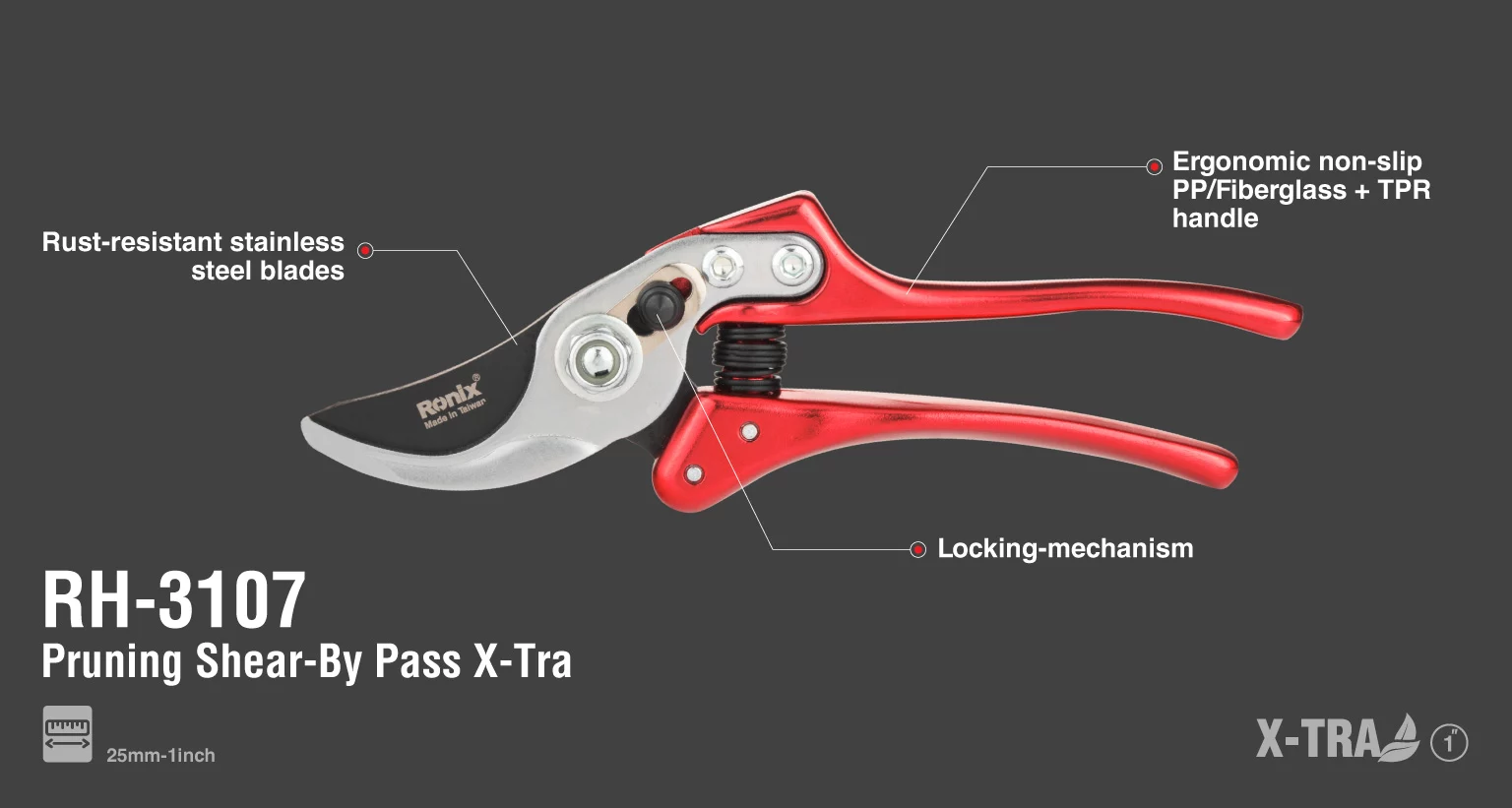 قیچی باغبانی X-tra رونیکس مدل RH-3107 مناسب برای هرس کاری حرفه ای است که ساخت کشور تایوان می باشد. این ابزار دارای تیغه های تیز و تولید شده از فولاد کربنی مقاوم در برابر زنگ زدگی است که امکان ایجاد برش های آسان و دقیق را فراهم می کند.