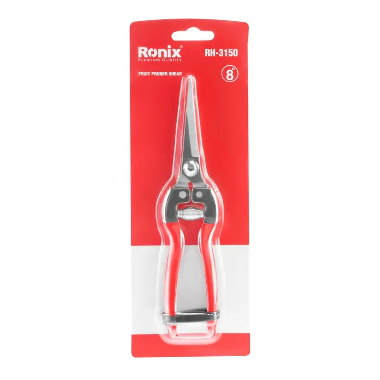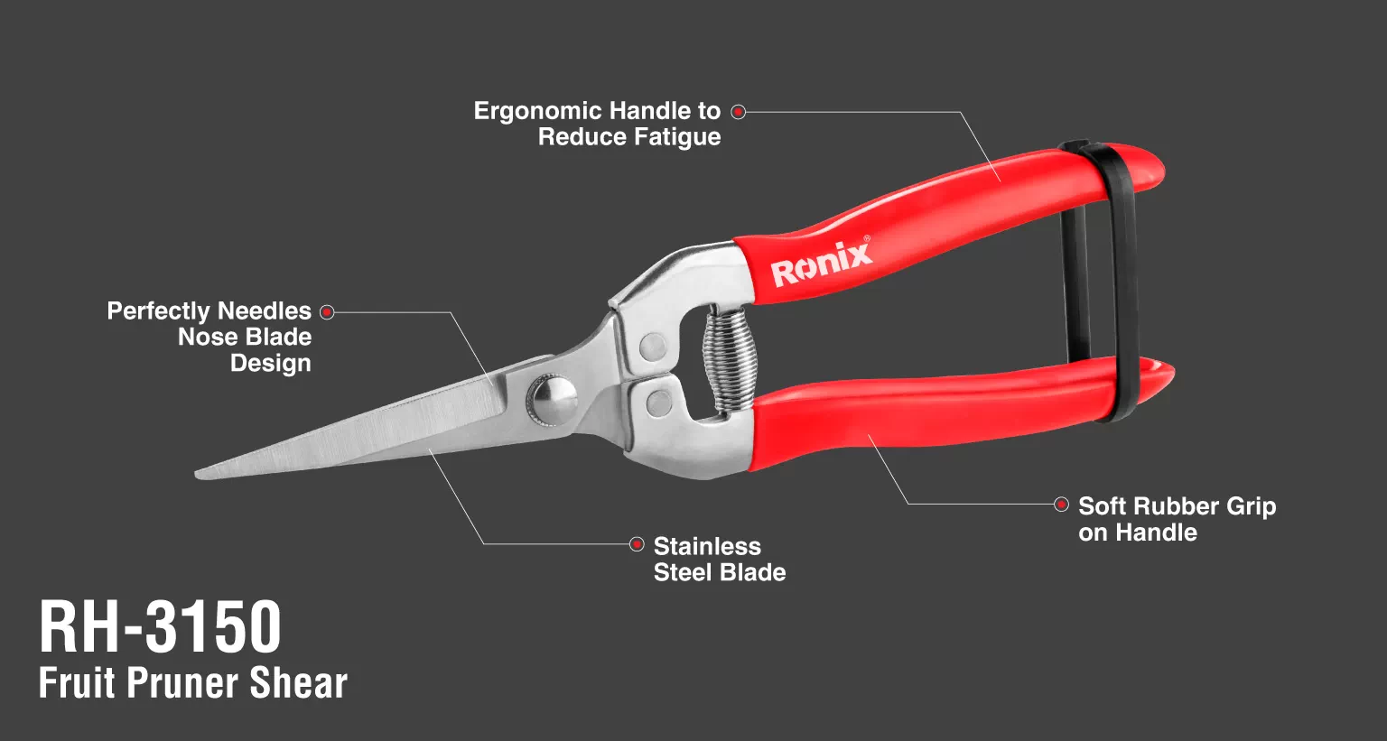 قیچیهای میوهچین در انواع مختلف دسته بلند و کوتاه، سر صاف، سرکج و ... به بازار عرضه میشوند و هرکدام نیز موارد استفاده خاص خود را دارند. محصول RH-3150 رونیکس، بهترین انتخاب برای برداشت میوه و قطع شاخههای ظریف و باریک است.