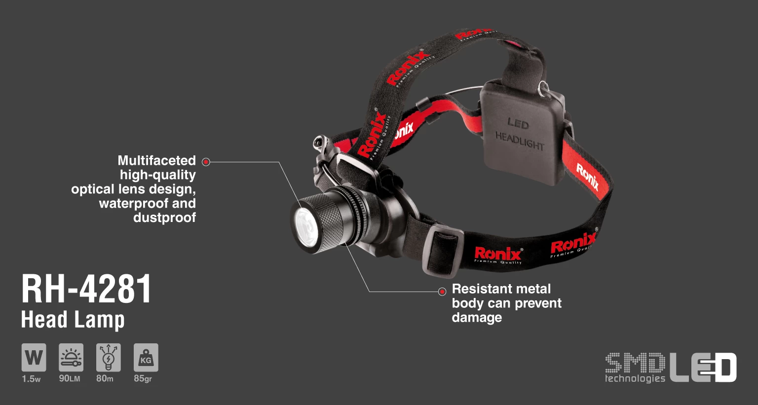 چراغ پیشانی RH-4281 جزء ابزارهای روشنایی از مجموعه Lumen Series است و گزینه ای ایده آل برای کوهنوردی، دوچرخه سواری، پیاده روی، طبیعت گردی و ... در تاریکی است. این هد لامپ از بدنه ای فلزی و مقاوم در برابر ضربات احتمالی برخوردار بوده که کاربرد آن را در محیط های مختلف گسترش می دهد. این چراغ پیشانی به یک عدسی شیشه ای ضد خش، شفاف و مقاوم در برابر گرد و غبار و آب مجهز شده که نور را با بالاترین کیفیت متمرکز می کند. لامپ این چراغ پیشانی از نوع CREE XPE-R2 با شدت روشنایی 90 لومن است که می تواند فضای مقابل را تا برد 80 متر روشن کند. چراغ پیشانی 90 لومن RH-4281 نیازمند 3 عدد باتری نیم قلمی AAA برای روشنایی است و با استفاده مداوم می تواند به مدت 5 تا 6 ساعت کار کند. از دیگر ویژگی های مدل RH-4281 رونیکس قابلیت تنظیم بند پارچه ای کشی بوده تا کاربر بتواند آن را به اندازه دلخواه تنظیم کند. در ضمن محدوده دمای کارکرد این هدلامپ از 0 تا 40 درجه سانتی گراد و محدوده دمای نگهداری آن 10- تا 50 درجه سانتی گراد می باشد.