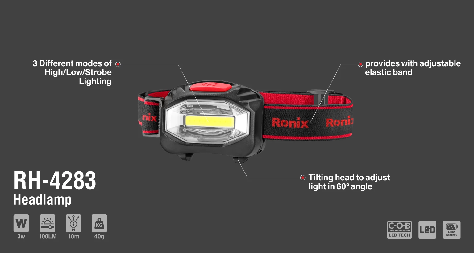 رونیکس با در نظر گرفتن نیازهای شما، چراغ پیشانی خود را با کیفیت بالا تولید کرده و آن را با مدل RH-4283 روانه بازار کرده است. در این هد لامپ سبکوزن و پرکاربرد، 3 حالت مختلف نورپردازی قوی، ضعیف و چشمکزن برای پوششدهی طیف وسیعی از فعالیتها تعبیه شده است. این چراغ پیشانی از LEDهای باکیفیت با روشنایی 100 لومن بهره میبرد و دمای رنگ نور در آن در محدودده 8000-7000 کلوین قرار دارد.