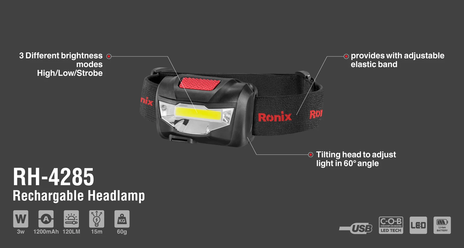 رونیکس با در نظر گرفتن نیازهای شما، انواع هدلامپ را با کارایی بالا تولید و آنها را روانه بازار کرده است. چراغ پیشانی RH-4285 یکی از آنها است! در این ابزار سبکوزن و پرکاربرد، 3 حالت مختلف نورپردازی قوی، ضعیف و چشمکزن برای پوششدهی فعالیتهای مختلف شما تعبیه شده است. این چراغ پیشانی از LEDهایی با روشنایی 120 لومن بهره میبرد و دمای رنگ نور در آن در محدوده سفید یخی قرار دارد.