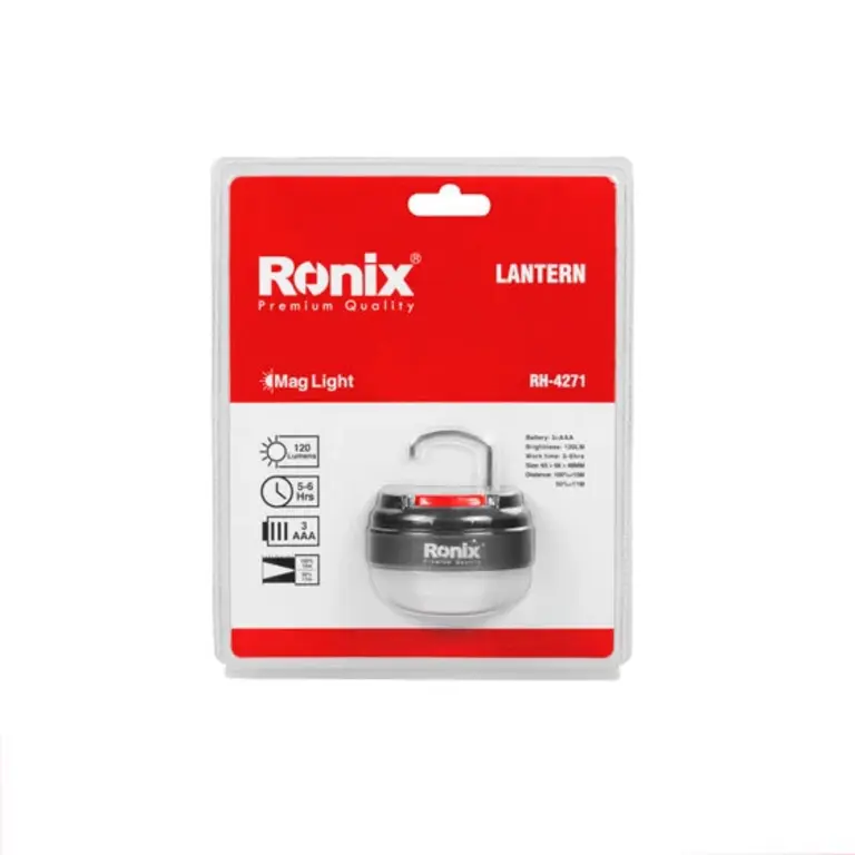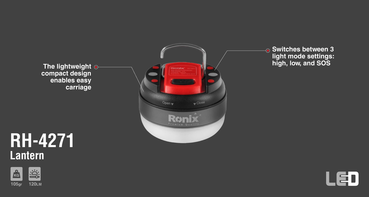 چراغ گرد آهنربایی RH-4271 رونیکس گزینه ای مناسب برای مصارف خانگی، کمپینگ و طبیعت گردی است و می تواند به خوبی داخل چادرهای مسافرتی و محیط های تاریک را روشن کند. این چراغ از قابلیت تنظیم در سه حالت نوردهی برای استفاده در شرایط مختلف برخوردار است و می توان آن را در حالت نور زیاد %100، نور متوسط %50 و نیز حالت چشمک زن قرار داد. از دیگر ویژگی های این چراغ برخورداری از پایه آهنربایی است که به راحتی بر روی سطوح فلزی نصب می شود. همچنین جهت آویزان کردن در داخل چادر و هر جای دیگر یک قلاب آویز فلزی برای این ابزار در نظر گرفته شده است. بدنه این چراغ گرد آهنربایی بسیار مقاوم بوده و از آسیب در برابر شرایط احتمالی جلوگیری می کند. همچنین این محصول از ابعاد کوچک و وزن سبکی برخوردار است و با 12 عدد لامپ LED به توان 0.2 وات می تواند حداکثر نوری به مقدار 120 لومن تولید کند. مدل RH-4271 رونیکس برای روشن شدن به سه باتری نیم قلمی AAA نیاز است که می تواند در مدت زمان 5 تا 6 ساعت روشنایی ایجاد کند.