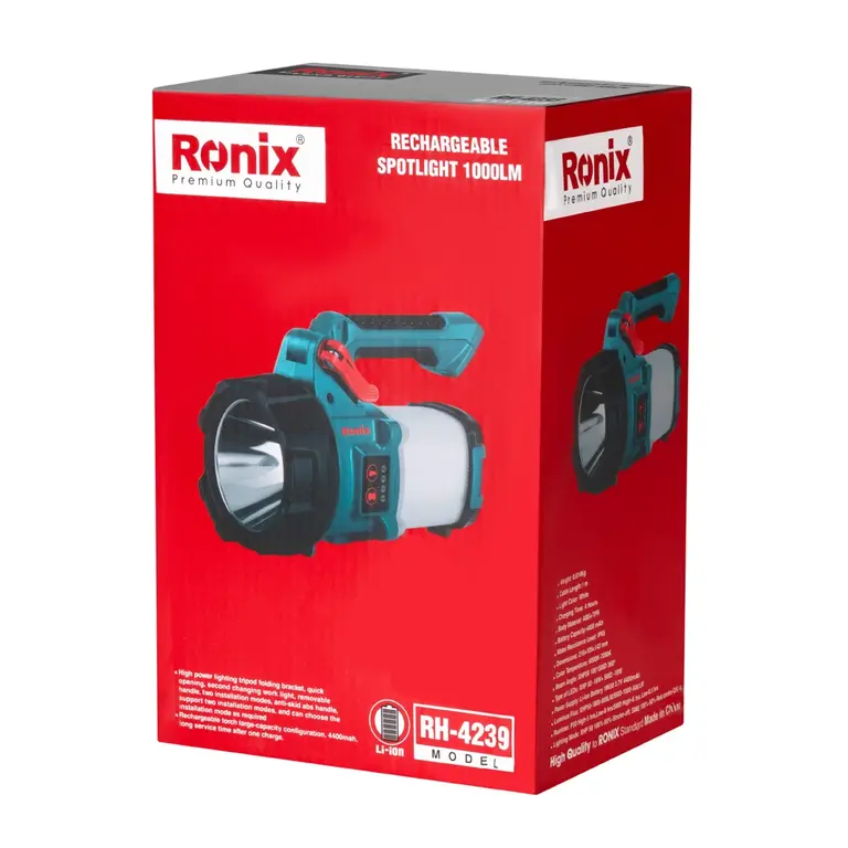 نورافکن شارژی RH-4239 در جعبه رنگی رونیکس همراه با متعلقات کاربردی به بازار ابزار عرضه میشود.