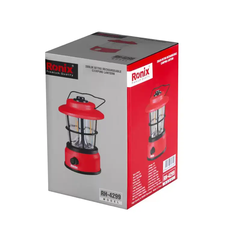 چراغ روشنایی فانوسی شارژی 280 لومن رونیکس مدل RH-4299، در جعبه رنگی رونیکس به همراه یک کابل شارژ به بازار ابزار ایران عرضه میشود.