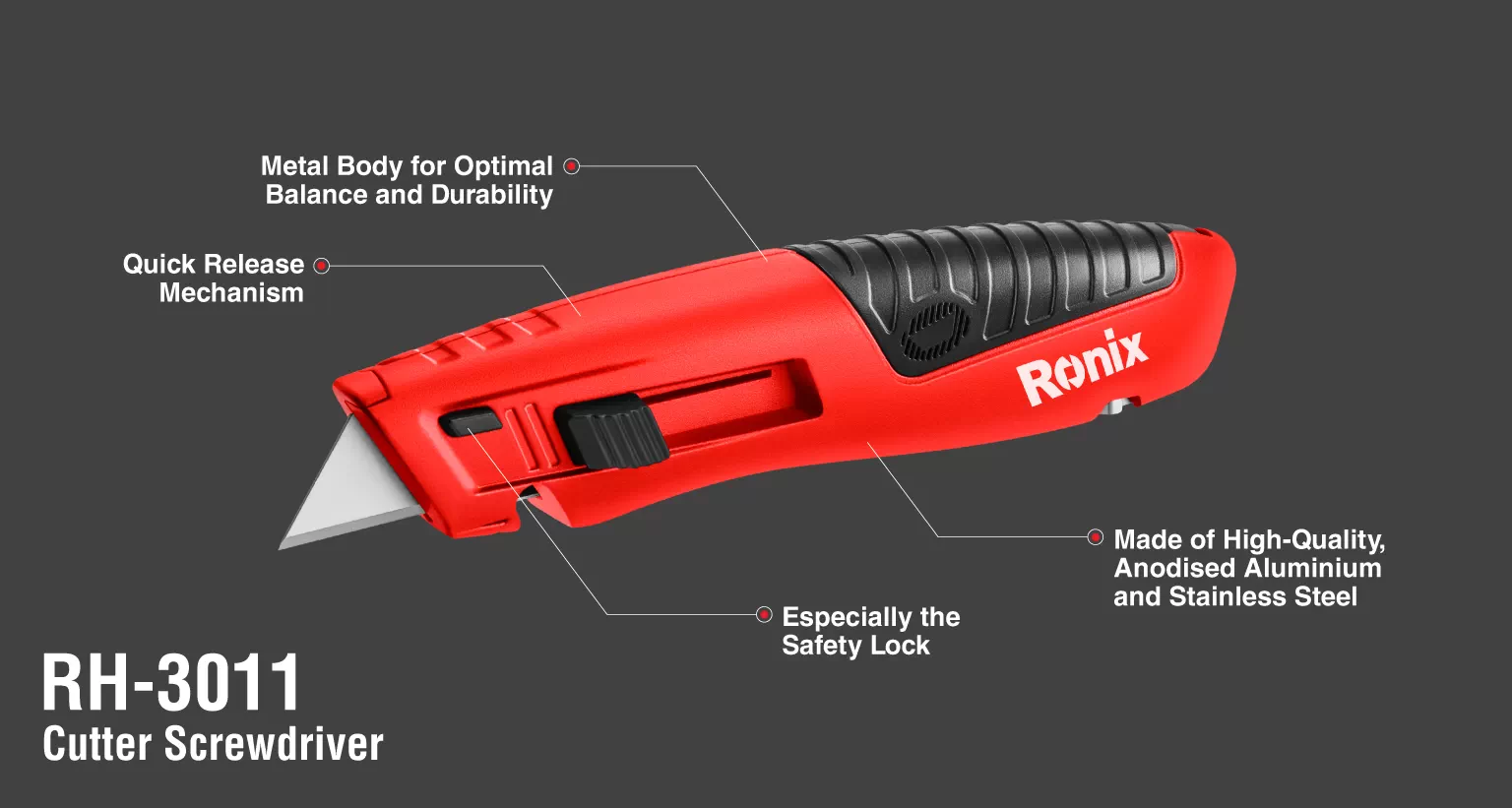 - کاتر چند کاره ساخته شده از مواد آلومینیوم و استیل آنودایز شده و تیغه هایی از جنس استیل ضد زنگ، مقاوم در برابر رنگ زدگی