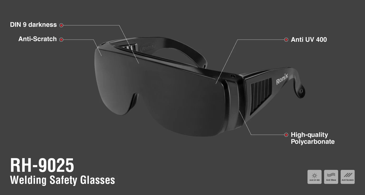 عینک ایمنی جوشکاری برای محافظت از چشمان کاربران در برابر گرما، اشعهی شدید فرابنفش، مادون قرمز و پرش قطعات جوش در حین عملیات جوشکاری و برش مورد استفاده قرار میگیرد. در صورت عدم استفاده از این عینکها، احتمال بروز سوختگی شدید، فوتوکراتیت یا فلش جوشکاری بیشتر میشود. عینک ایمنی پلیکربنات RH-9025 رونیکس، لنز شفافی دارد؛ ضد خش است و موجب محافظت موثر از چشم و گوشهی صورت کاربران در برابر گرما و پاشش قطعات جوشکاری میشود.