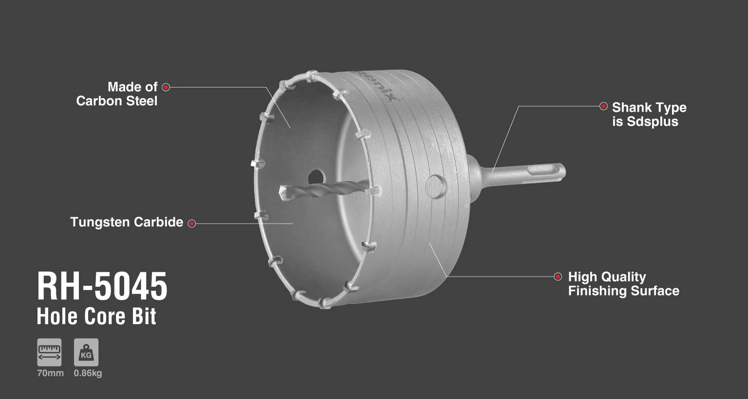 رونیکس در طراحی انواع متههای گردبر خود نهایت ظرافت و دقت را به خرج داده تا متههایی کاربردی و باکیفیت را به مشتریان تحویل دهد. گردبر بتن 100 چهارشیار رونیکس مدل RH-5045، یکی از متههای گردبر این مجموعه، با قطر سوراخ 100 میلیمترساخته میشود.