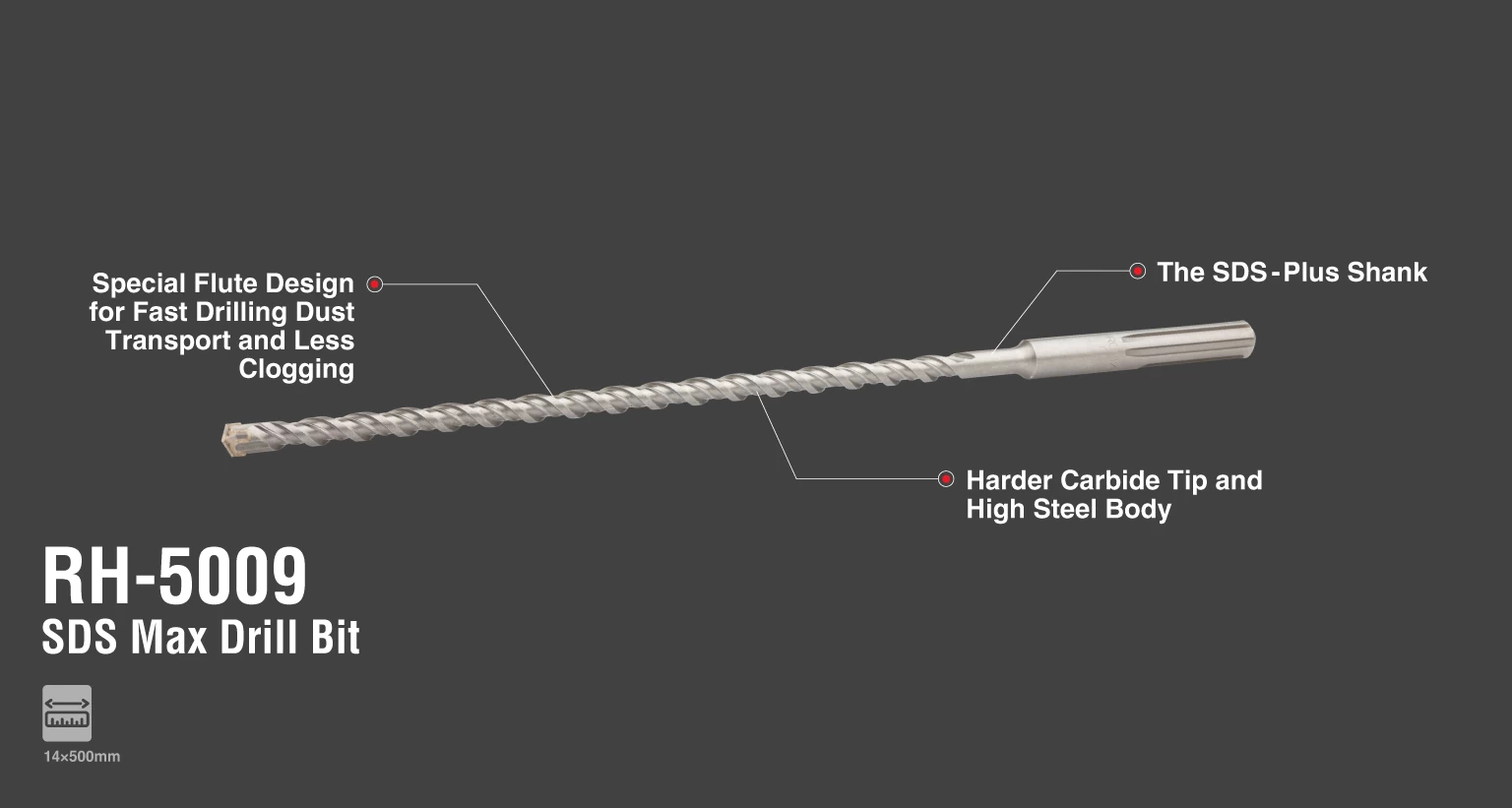 بدنه مقاوم فولادی، طراحی ویژه شیارها و حداکثر تماس سطح الماسه با قطعه کار از دیگر ویژگیهای مته پنج شیار 500×14 رونیکس مدل RH-5009 هستند.