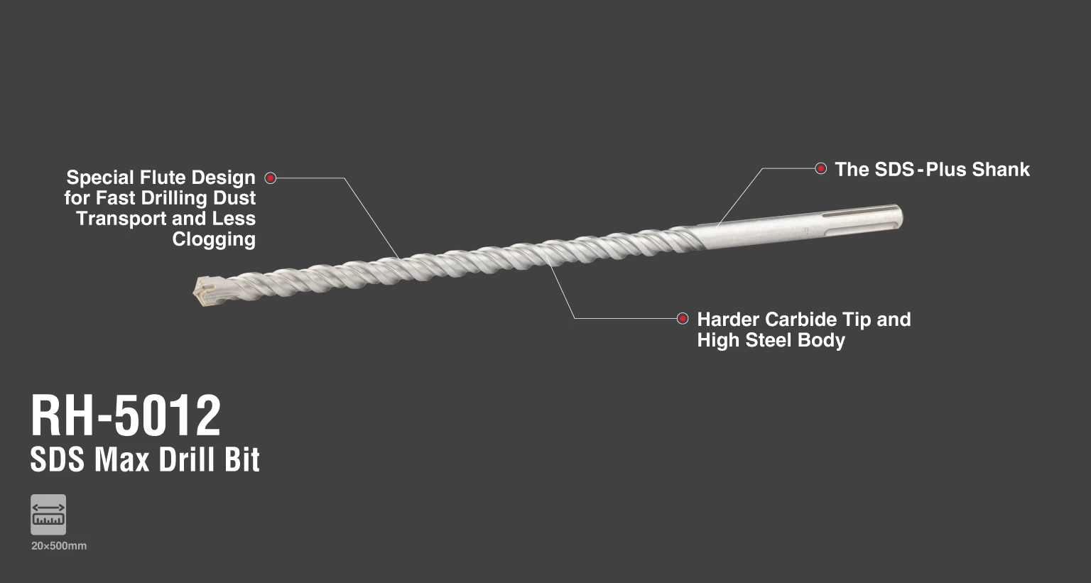 مته الماسه پنچ شیار 500×20 SDS-Max رونیکس مدل RH-5012، دارای اندازه استاندارد برای ایجاد سوراخهای استاندارد بوده و برای بتنکنهای شارژی و برقی موجود در بازار مناسب است. این مته با قطر 20 میلیمتر و طول 500 میلیمتر ساخته شده و نوک آن در درجه حرارت بالا سختکاری شده است.