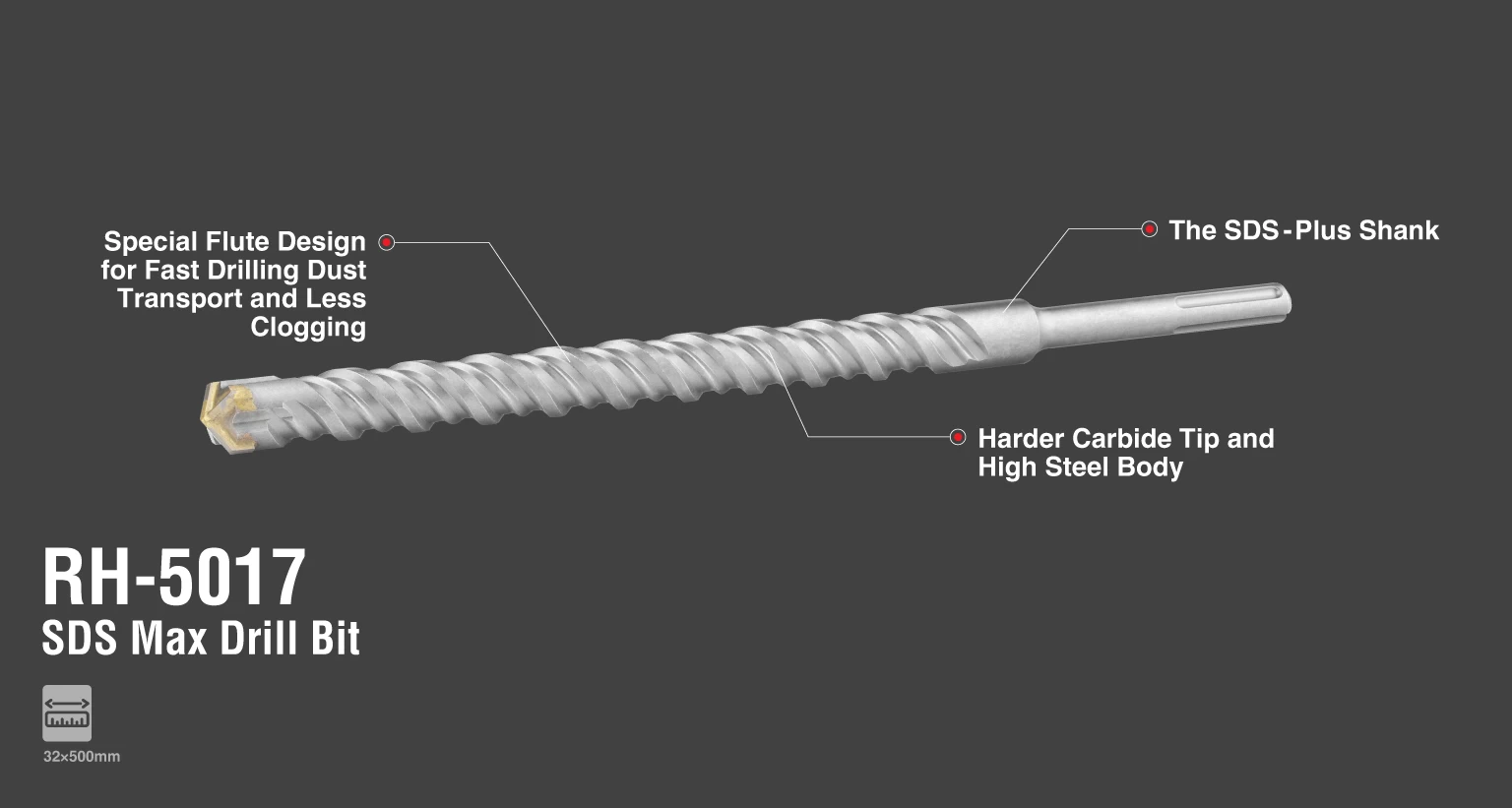 رونیکس علاوهبر تولید انواع ابزارآلات سوراخکاری، تولیدکننده انواع مته برای کاربریهای مختلف این ابزارها است. مته پنج شیار 500×32 رونیکس مدل RH-5017 یکی از بهترین متههای موجود در بازار و ساختهشده از مواد باکیفیت بالا است. محصولی با بدنه فولادی و شیارهای مارپیچی و دقیق که برای سوراخکاری در بتن، مصالح ساختمانی و سنگ ایدهآل است.