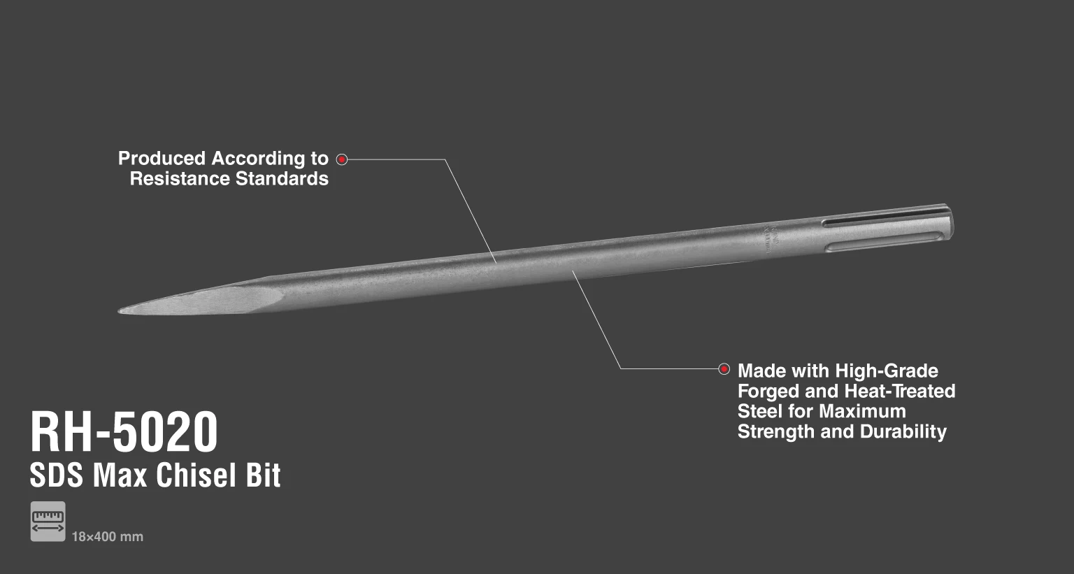 قلم نوک تیز پنج شیار RH-5020 ابزاری ایده آل برای بتن کن ها و چکش های تخریب است و مناسب استفاده در سطوح سخت همانند بتن، کاشی، بلوک و آجر می باشد. این قلم از ساختاری مقاوم و تیز برخوردار بوده و برای کاربری های مختلف تخریب مورد استفاده قرار می گیرد. قلم نوک تیز RH-5020 ساخته شده از فولاد باکیفیت فورج شده و سخت کاری شده در درجه حرارت بالا می باشد که حداکثر مقاومت و دوام را در برابر فشار حاصل از تخریب سطوح بتنی دارد. این نوع قلم تولید شده بر اساس استانداردهای سختی سنجی و مطابق بر اساس تکنولوژی های روز دنیاست و می تواند در عملیات تخریب کاربری آسان و سرعت بالایی را به وجود آورد.