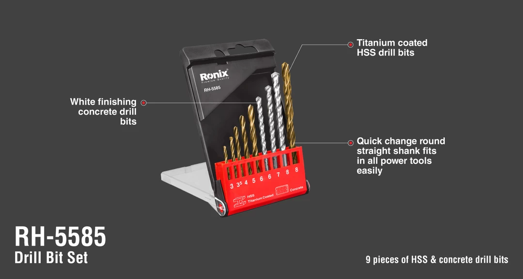 ست RH-5585 رونیکس شامل اندازه های مختلف مته است که برای افزایش مقاومت و کارایی با روکش تیتانیوم پوشیده شده اند. به علاوه طراحی شیارهای این مته ها به شیوه ای حرفه ای صورت گرفته تا گرد و خاک و خرده چوب های چوب ناشی از سوراخ کاری را به راحتی به بیرون انتقال دهد. این شیارها همچنین تأثیر بسیاری در خنک شدن مته به هنگام انجام کار و در نتیجه افزایش طول عمر این ابزار دارد. بسته بندی پلاستیکی و مقاوم ABS به منظور جلوگیری از آسیب به آن ها و همچنین امکان حمل و نقل آسان برای این ست در نظر گرفته شده است.