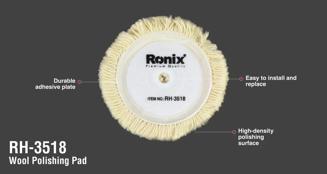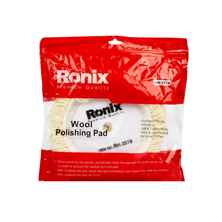 این پد پولیش 180 میلی متری از 90 درصد پشم طبیعی تولید شده که بافت آن از استحکام بالایی برخوردار است و عمر طولانی تر و کاربری بلند مدت آن را تضمین می کند. از دیگر ویژگی های این پد می توان به برخورداری از صفحه ای کاملا بالانس جهت دقت و کیفیت بالا در حین پولیش کاری اشاره کرد. همچنین رشته های بلند مدل RH-3518 رونیکس امکان پولیش کاری در گوشه ها را فراهم می کند.