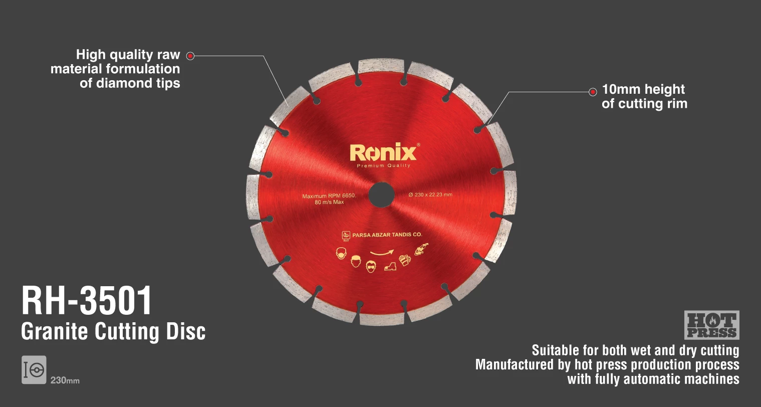 صفحههای گرانیتبر رونیکس به قطرهای 115، 125، 180 و 230 میلیمتر تولید شده و به بازار عرضه میشوند. سایز این صفحهها با توجه به قطر و اندازهی دستگاه فرز و نوع کاربری مورد نظر انتخاب میشود. صفحه گرانیتبر 3501-RH رونیکس با قطر 230 میلیمتر، با روش Hot Press و مطابق استانداردهای TUV و CE اروپا ساخته شده است. در نتیجه، در برابر فشار حاصل از کار بر سطوح بسیار متراکم گرانیت، مقاومت بسیار بالایی دارد. این صفحه، از مواد باکیفیت بسیار بالا ساخته شده و از آن جهت برشهای خشک و تر استفاده میشود. همچنین، سگمنت بلند 10 میلیمتری در کنار تیغه الماسهی باکیفیت آن، برش گرانیت را برای کاربر راحتتر میکند.