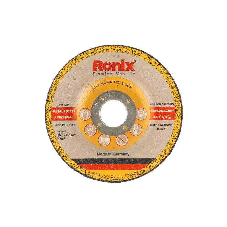سنگ ساب آهن 22 × 6 × 115 میلی متری آلمانی رونیکس تحت عنوان کد محصول RH-3727 یکی از نمونههای با کیفیت و مطرح این نوع از سنگ ها است. این صفحه ساب قطری معادل 115 میلیمتر دارد و قطر محور آن نیز به حدود 22.2 میلیمتر میرسد. ضخامت این صفحه 6 میلیمتر است تا از پهنای کافی برای کارهای مداوم برخوردار باشد.
