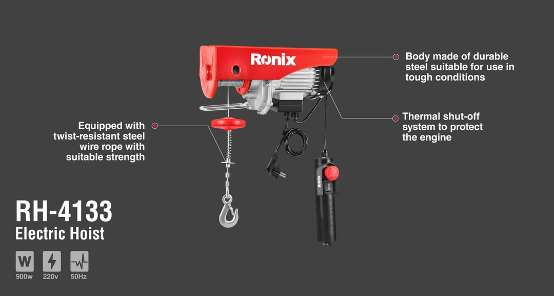 ظرفیت بار دوبل در بالابر برقی رونیکس مدل RH-4133 برابر با 500 کیلوگرم است. موتور قدرتمند این ابزار، با سیمپیچی مسی، تحت استاندارد CE اروپا و کلاس ایمنی IP54 تولید شده و دوام بالایی در کاربردهای طولانیمدت دارد.