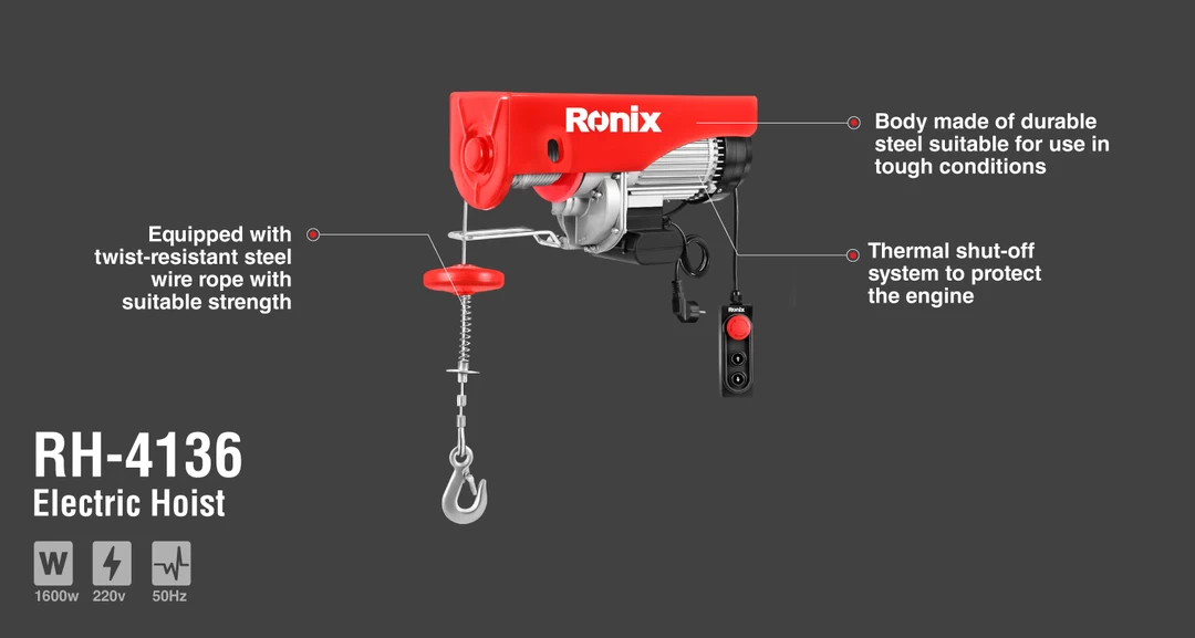 بالابر برقی رونیکس مدل RH-4136 دارای ظرفیت تحمل بار دوبل 1000 کیلوگرم بوده و به به یک موتور قدرتمند گیربکسی به توان 1600 وات مجهز است.