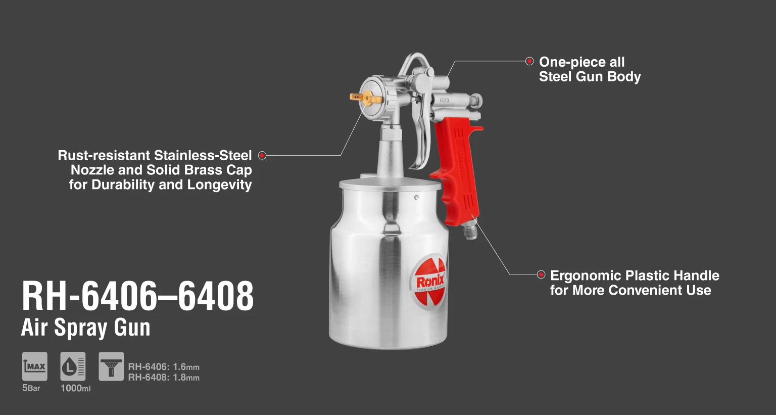 پیستوله بادی RH-6406-RH-6408رونیکس از مخزن آلومینیومی با ظرفیت 1000 میلی لیتر بهره میبرد و دارای سوزنهایی از جنس فلز ضد زنگ است که علاوه بر ایجاد پاشش یکدست دوام و عمر بالای این ابزار را تضمین میکند. به علاوه میتوان جریان خروجی رنگ این پیستوله رابرای دستیابی به ضخامت یکنواخت رنگ روی سطوح مورد نظر تنظیم کرد. این ابزار به کاربر این امکان را میدهد که میزان پاشش را مطابق با نیاز خود تنظیم کند و نیز بدون توقف، به رنگکاری سطوح وسیعتری بپردازد.